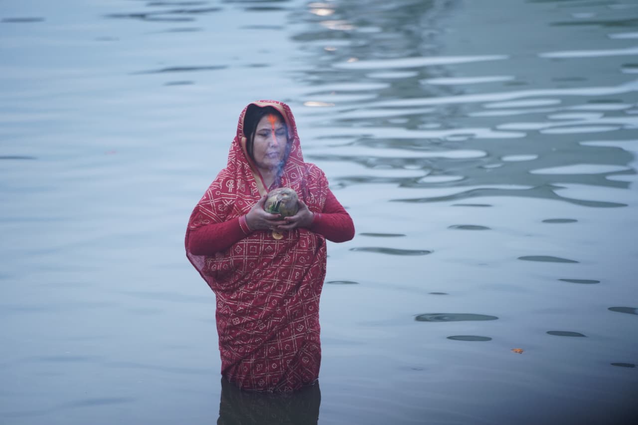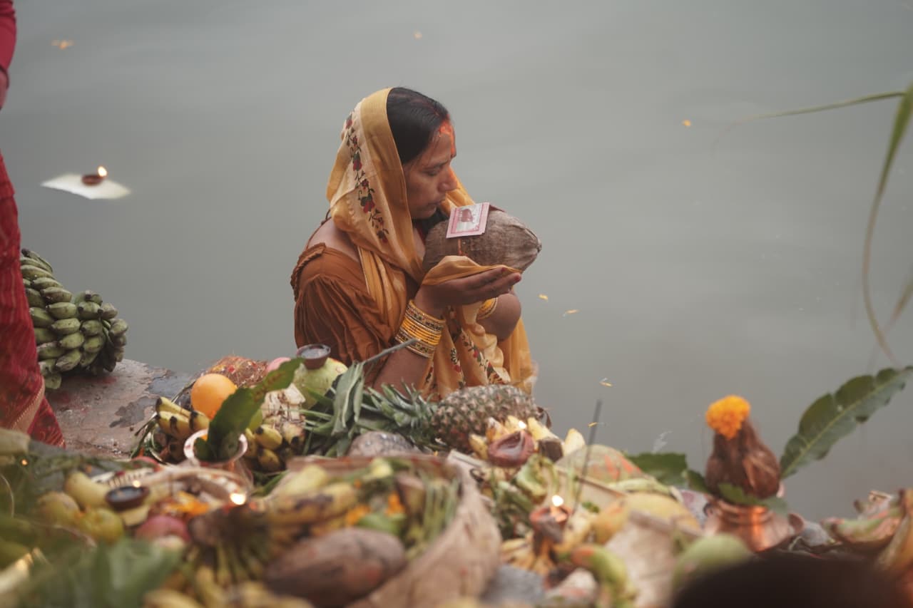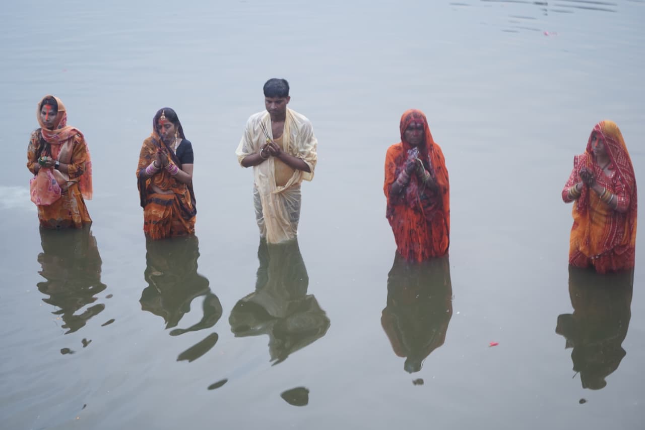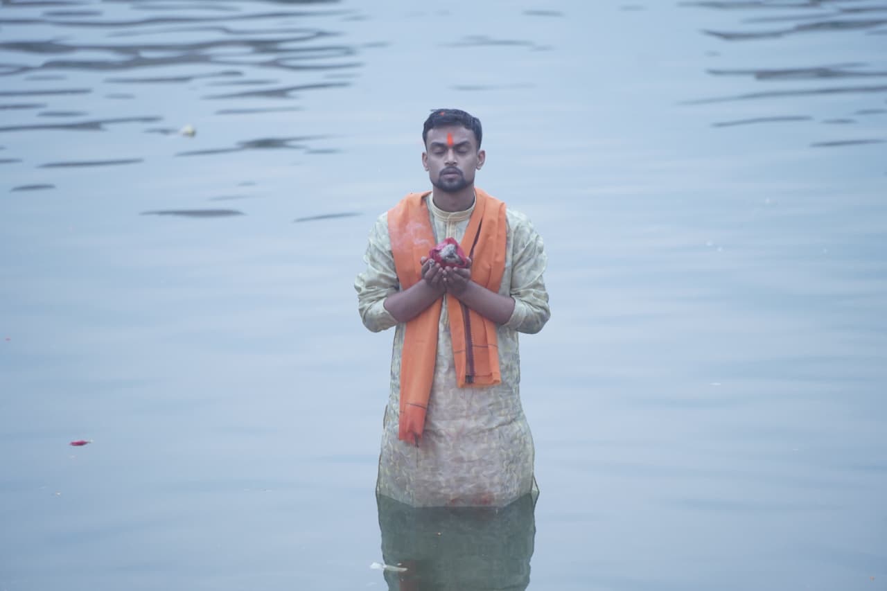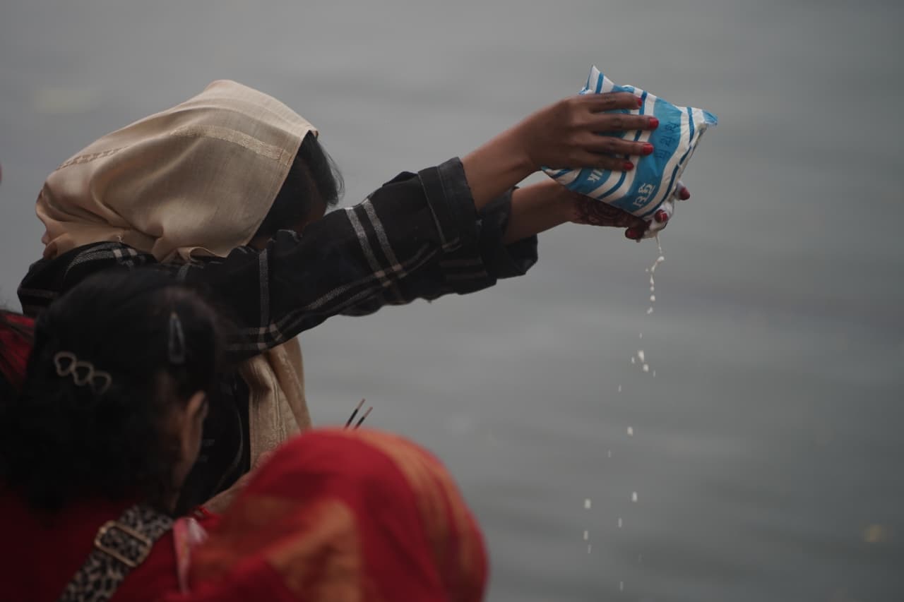 कमलपोखरीमा उदाउँदो सूर्यलाई अर्घ दिँदै (फोटो फिचर)