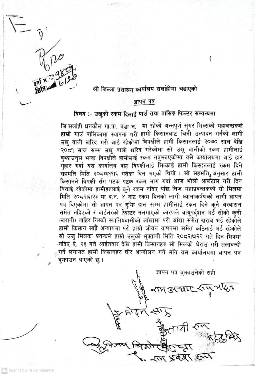 मलंगवा । सर्लाहीको धनकौल गाउँपालिकाका किसानहरूले अन्नपूर्ण सुगर मिल्सविरुद्ध रकम नदिएको आरोप लगाउँदै बिहिबार जिल्ला प्रशासन कार्यालयमा ज्ञापनपत्र बुझाएका छन्।