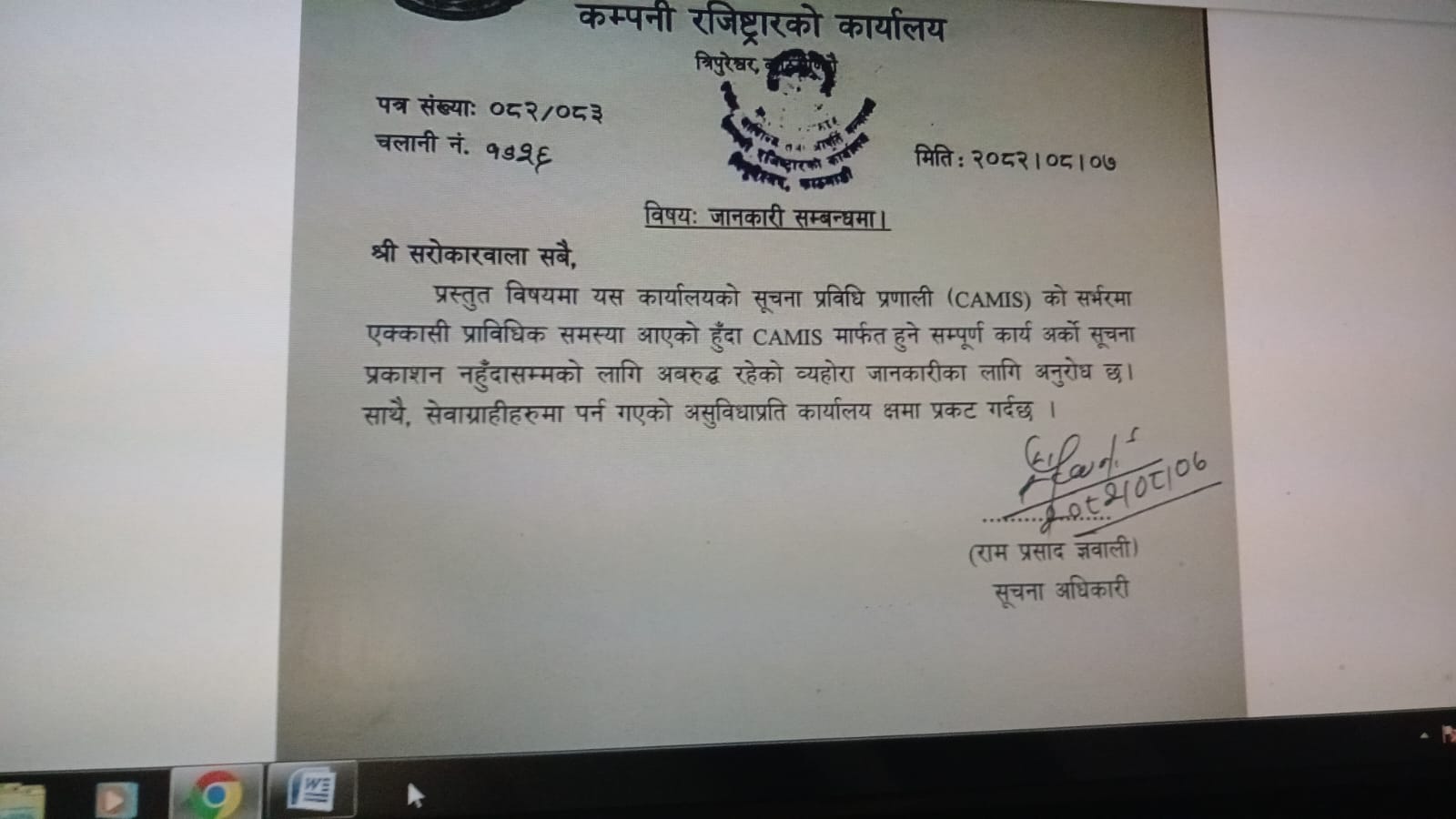 कार्यालयको सूचना प्रविधि प्रणाली (क्यामिस) को सर्भरमा एक्कासी प्राविधिक समस्या आएको भन्दै कार्यालयले अनलाइनमार्फत हुँदै आएको सेवा प्रवाह कम्पनी दर्ता, अद्यावधिक गर्नेदेखि कम्पनी खारेजीसम्मका सबै काम अवरुद्ध भएको जानकारी दिएको छ।