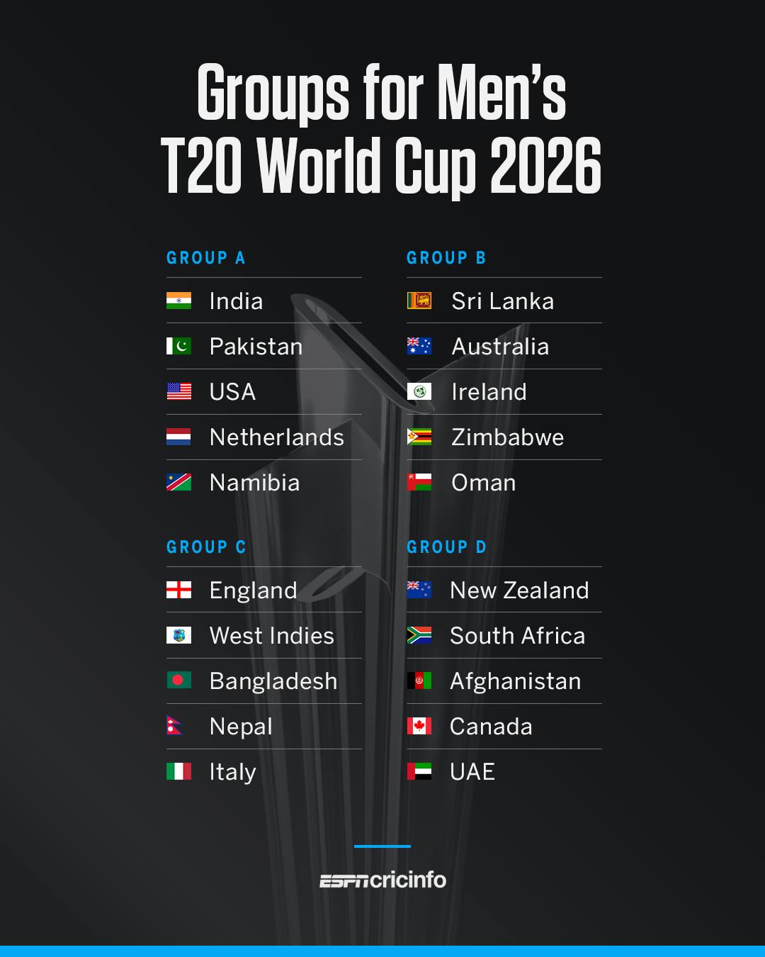 नेपालसहित २० टोलीको सहभागिता हुने उक्त विश्वकपको मंगलबार ‘ड्र’ र खेल ताालिका सार्वजनिक भएको छ। सार्वजनिक ड्रअनुसार नेपाल समूह सीमा रहेको छ। सो समूहमा वेस्ट इन्डिज, बङ्ग्लादेश, इङ्ग्ल्यान्ड र इटली रहेका छन्।
