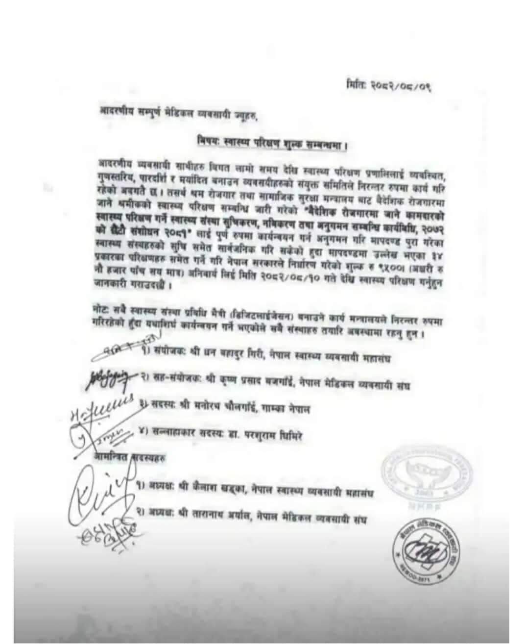 मन्त्रालयले बुधबार सम्पूर्ण मेडिकल व्यवासायीको नाममा परिपत्र गर्दै मेडिकल शुल्क बढाउन निर्देशन दिएको हो।