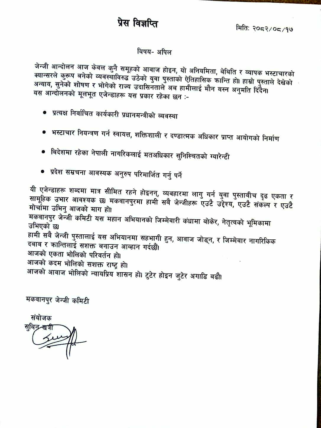 उनले अहिलेको अन्तरिम सरकार नेतृत्वकर्ताहरूबाट जेन–जीहरुको माग सम्बोधन गर्ने कुनै स्पष्ट संकेत नदेखिएकाले दबाब जारी राख्न सभी मकवानपुर जेन–जीहरूलाई संगठित भएर सम्पर्कमा आउन अपिल गरेका हुन् ।
