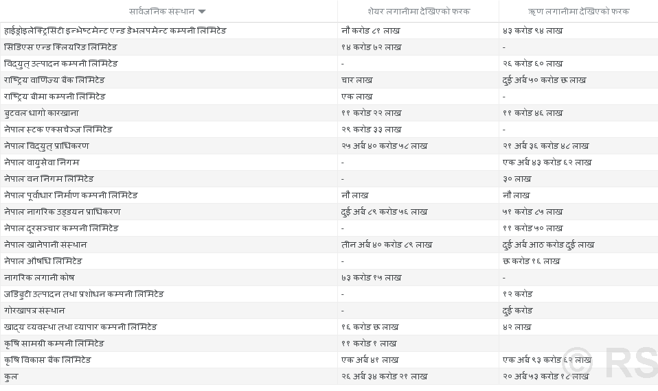सार्वजनिक ऋण व्यवस्थापन कार्यालयका अनुसार विभिन्न संस्थानमा सेयरतर्फ रू २६ अर्ब ३४ करोड २१ लाख र ऋणतर्फ रू २० अर्ब ५३ करोड १८ लाख गरी कुल रू ४६ अर्ब ८७ करोड ३९ लाख बराबर सरकारी लगानीको हिसाब मिल्न सकेको छैन । सरकारले धेरै लगानी गरेको भन्छ, तर संस्थानहरूले कम भन्छन् । दशकौँ अघिदेखिको हिसाबी गडबडीबारे जिम्मेवार को हो ? भन्ने प्रश्न पनि अनुत्तरित छ ।