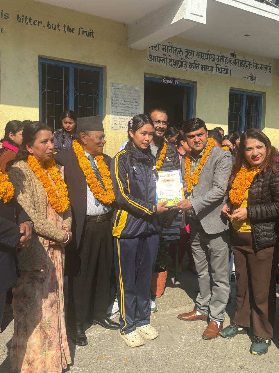 विद्यालयकी प्रधानाध्यापक रामकुमारी पौडेलले मेयर कपलगायत विभिन्न खेलकुद प्रतियोगितामा विद्यालयका विद्यार्थीहरूले हासिल गरेका उपलब्धिप्रति गर्व व्यक्त गर्दै रोटरीको सहयोगले विद्यार्थीहरूलाई ठूलो लाभ पुग्ने बता। कार्यक्रममा उत्कृष्ट खेलाडी विद्यार्थीहरूलाई सम्मानसमेत गरिएको थियो।