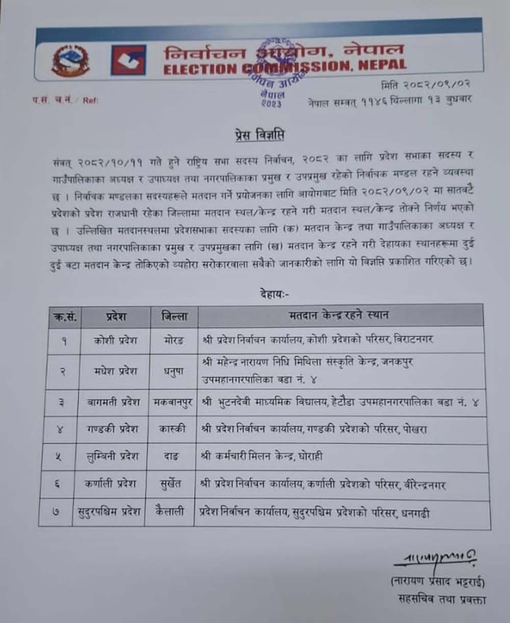 आयोगका सहसचिव तथा प्रवक्ता नारायण प्रसाद भट्टराईका अनुसार पुस २ गते बधुबार सातै वटा प्रदेशको प्रदेश राजधानी रहेका जिल्लामा मतदान स्थल/केन्द्र तोक्ने निर्णय भएको हो।
