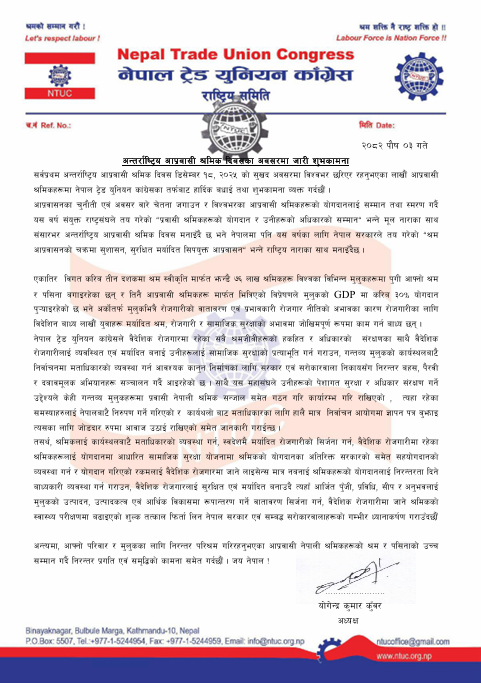 काठमाडौं । अन्तर्राष्ट्रिय आप्रवासी श्रमिक दिवसका अवसरमा नेपाल ट्रेड युनियन कांग्रेसले विश्वभर कार्यरत आप्रवासी श्रमिकहरूको योगदानको सम्मान गर्दै उनीहरूको अधिकार सुनिश्चित गर्न सरकारसँग माग गरेको छ ।