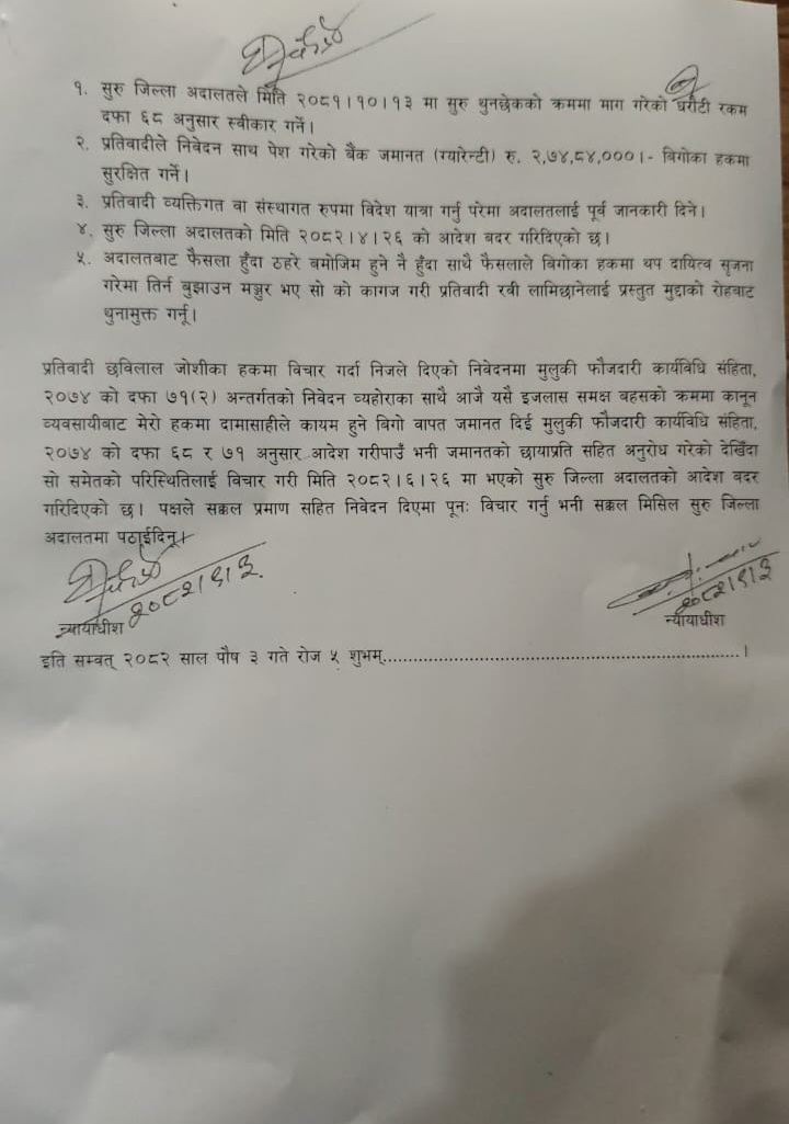 यसरी सुरु रुपन्देही जिल्ला अदालतले विसं २०८१ माघ १३ मा सुरु थुनछेकको क्रममा माग गरेको धरौटी रकम दफा ६८ अनुसार स्वीकार गरी प्रतिवादीले निवेदन साथ पेस गरेको बैंक जमानत (ग्यारेन्टी) रु दुई करोड ७४ लाख ८४ हजार बिगोका हक सुरक्षित गर्ने भनी आदेशमा भनिएको छ ।।