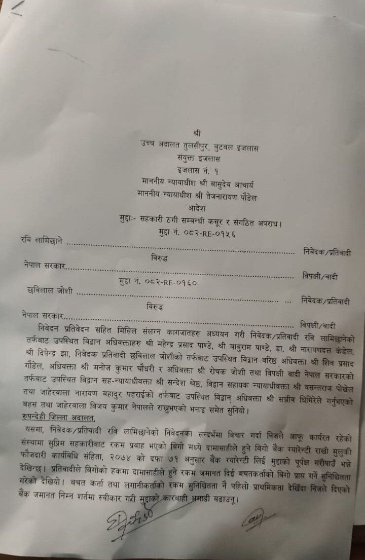 उच्च अदालत तुलसीपुर बुटवल इजलासका न्यायाधीश वासुदेव आचार्य र तेजनारायण पौडेलको इजलासले अदालतबाट अन्तिम फैसला हुँदा ठहरे बमोजिम हुने नै हुँदा बिगोका हकमा थप दायित्व सृजना गरेमा र तिर्न बुझाउन मञ्जुर भए सो को कागज गरी प्रतिवादी रवी लामिछानेलाई सुप्रिम सहकारीको रकम ठगी मुद्दाको रोहबाट थुनामुक्त गर्नु भनी आदेश भएको अदालतका सूचना अधिकारी रामबहादुर कुँवरले जानकारी दिए।