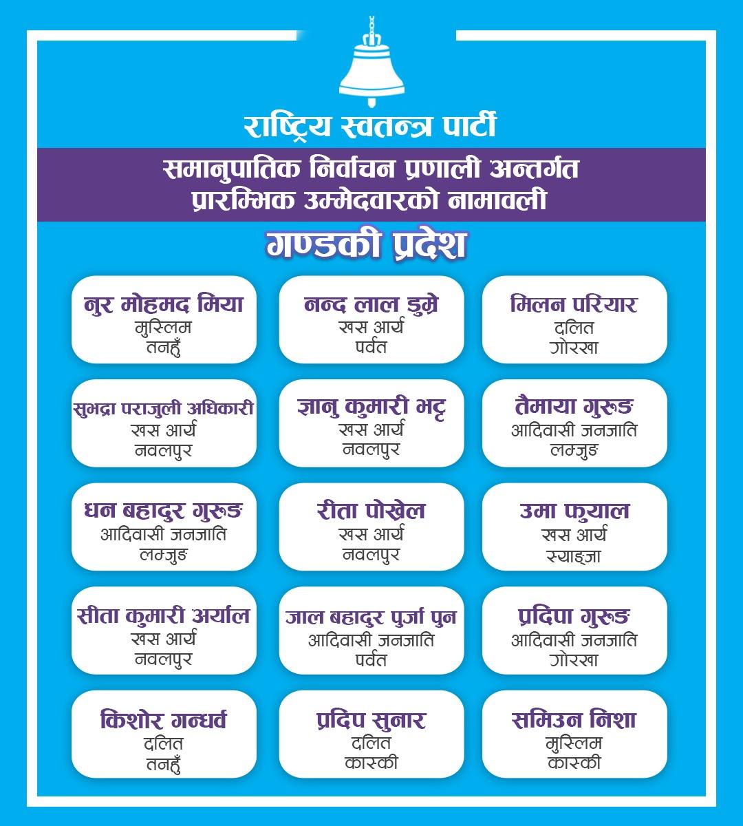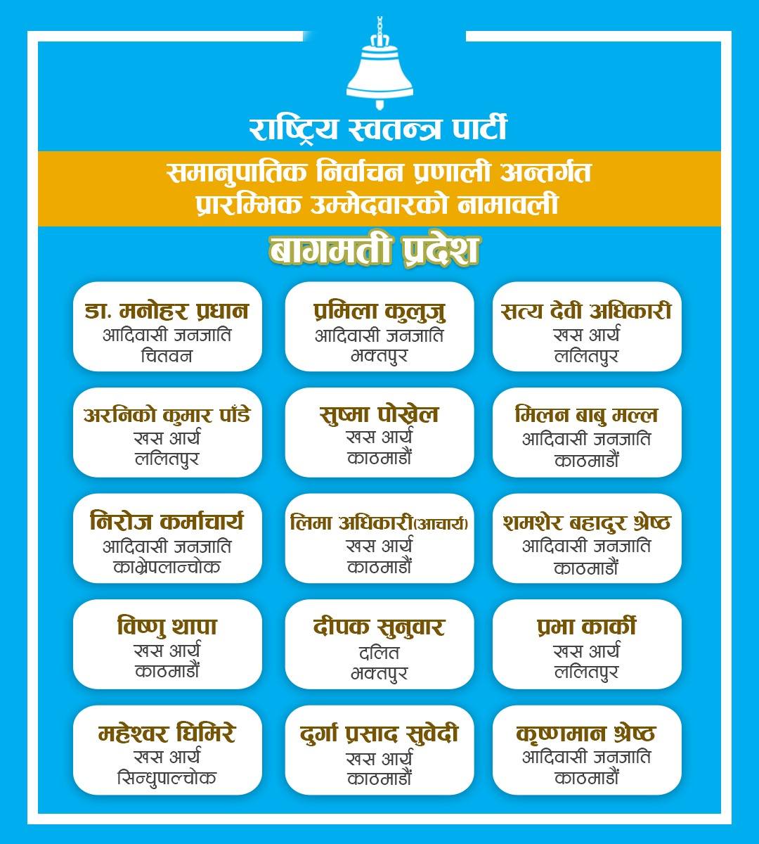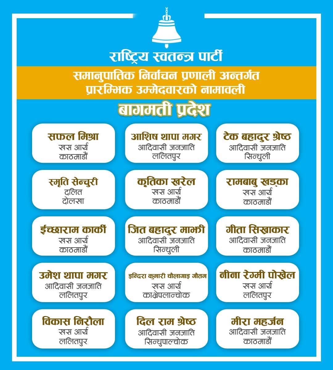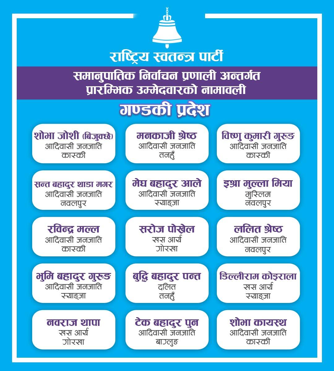 काठमाडौं। राष्ट्रिय स्वतन्त्र पार्टी (रास्वपा) बाट प्रतिनिधि सभाको समानुपातिक तर्फको उम्मेदवार हुनका लागि मंसिर मसान्तसम्म ३२५ जनाको आवेदन परेको छ।