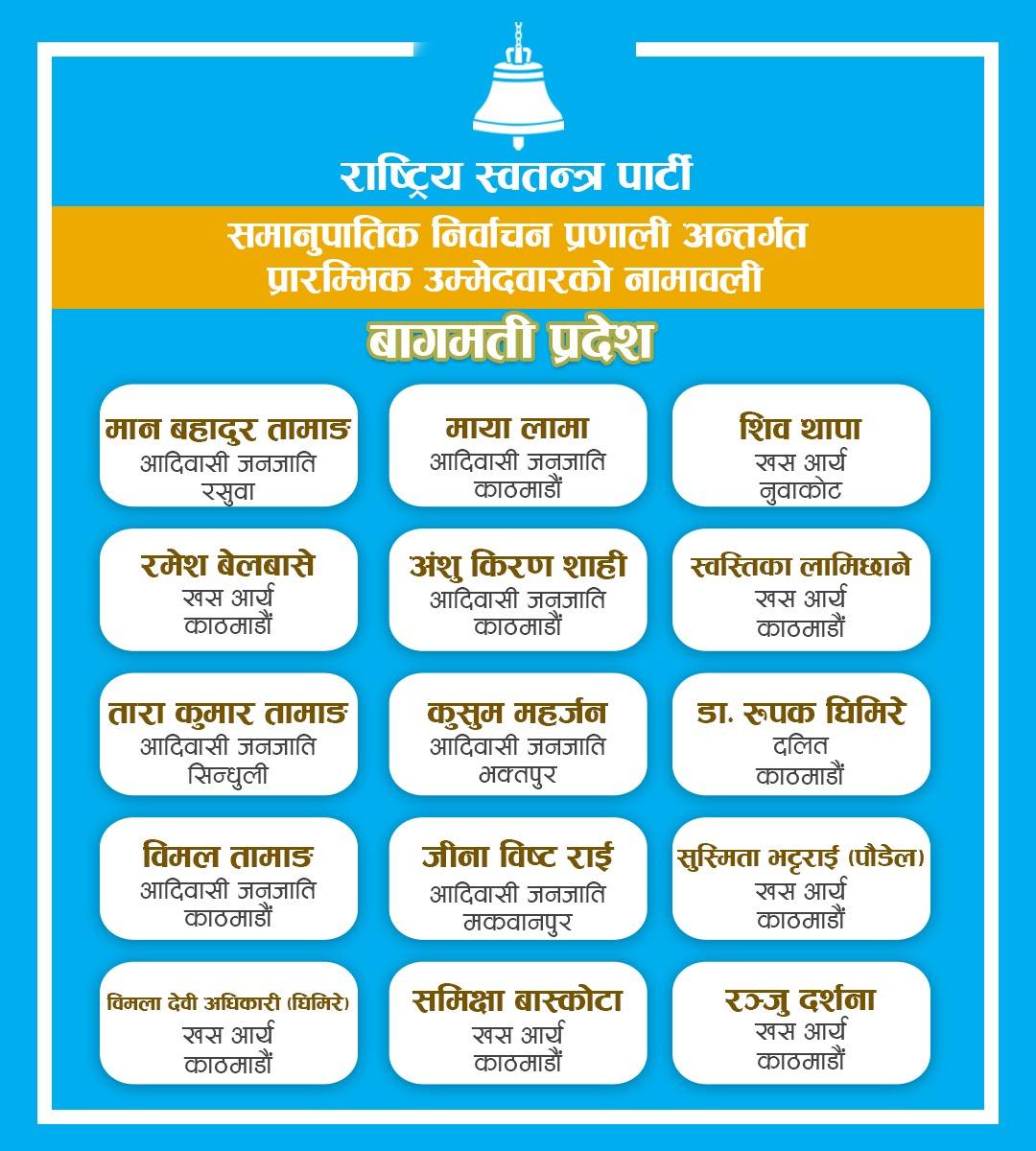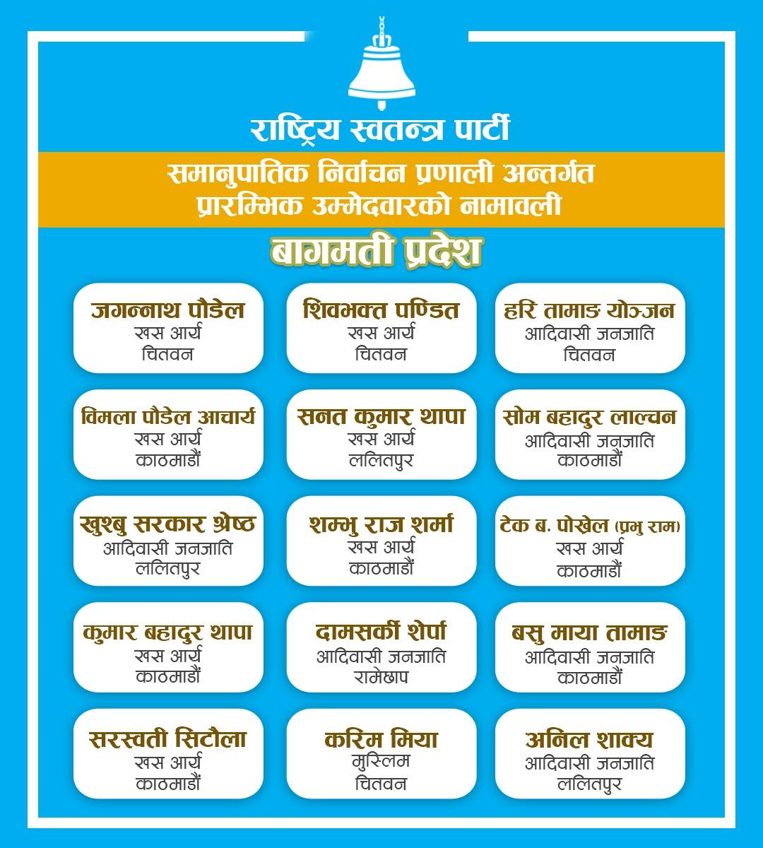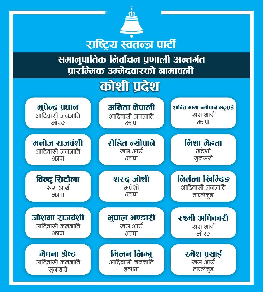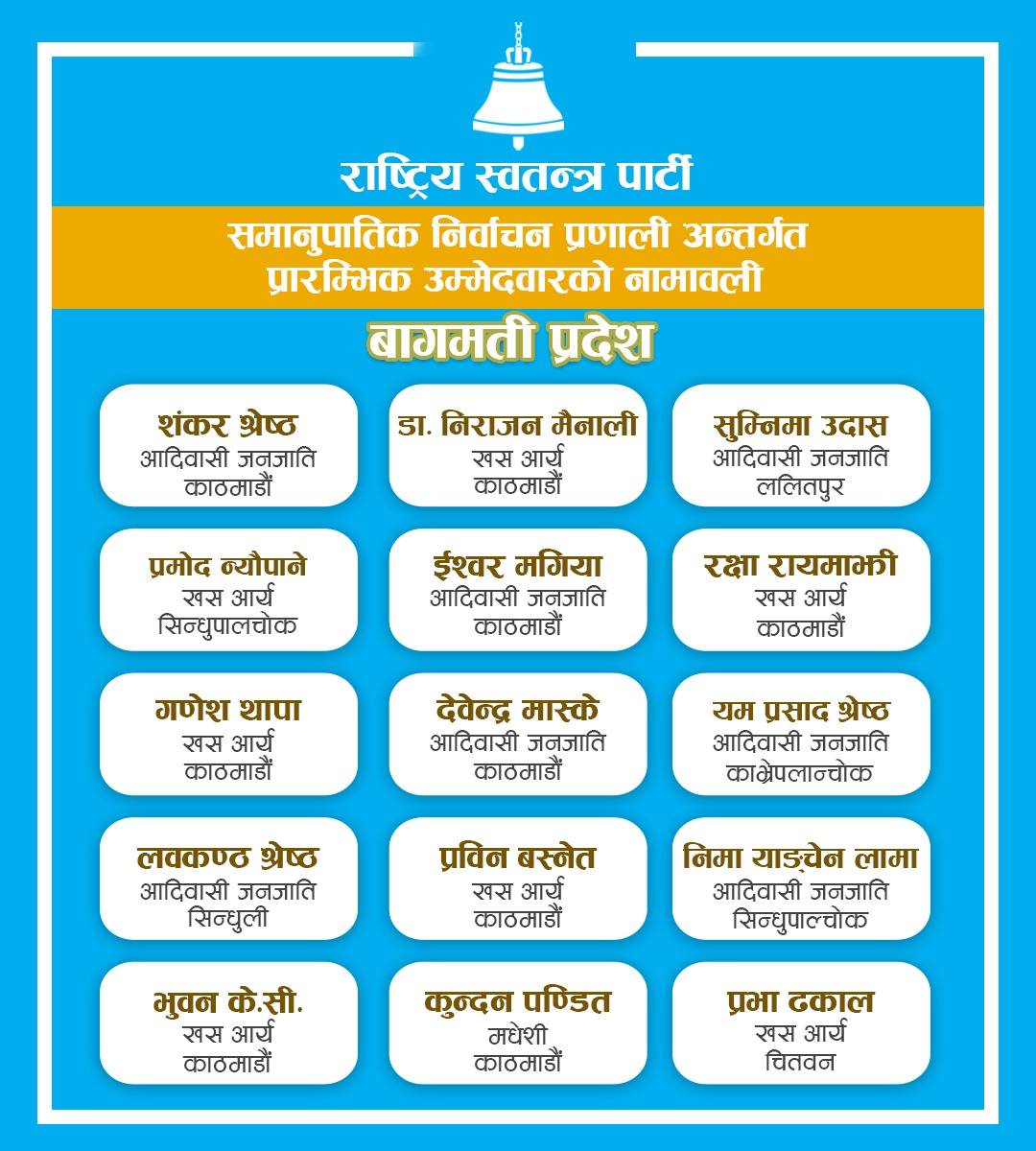 काठमाडौं। राष्ट्रिय स्वतन्त्र पार्टी (रास्वपा) बाट प्रतिनिधि सभाको समानुपातिक तर्फको उम्मेदवार हुनका लागि मंसिर मसान्तसम्म ३२५ जनाको आवेदन परेको छ।