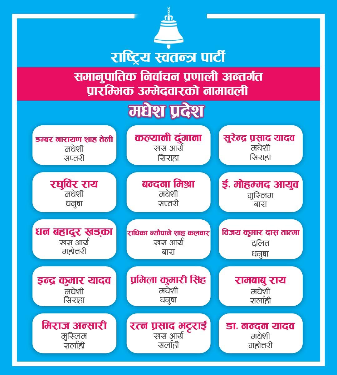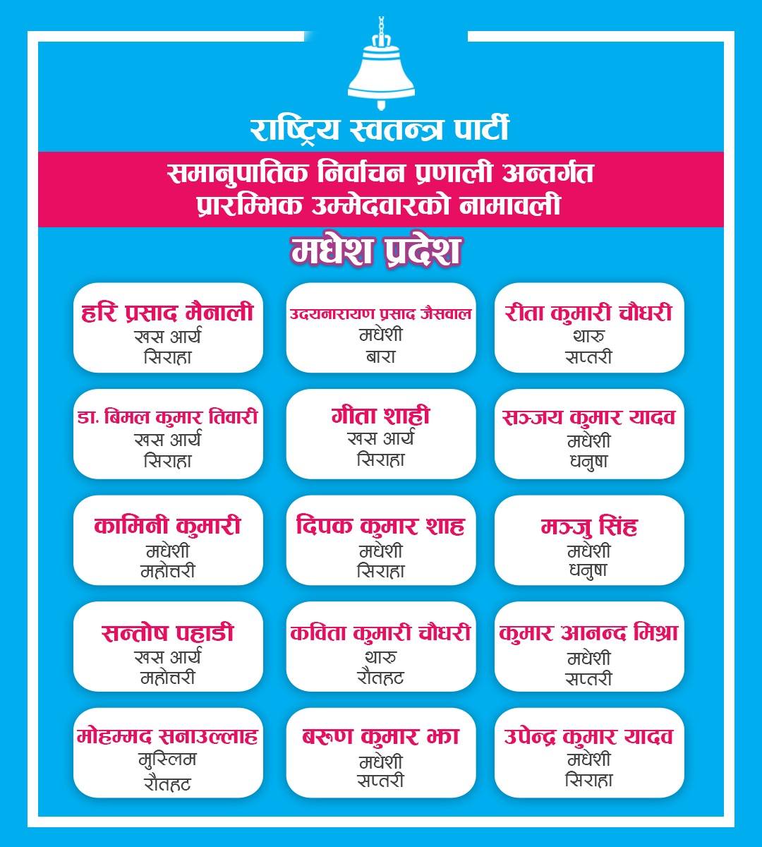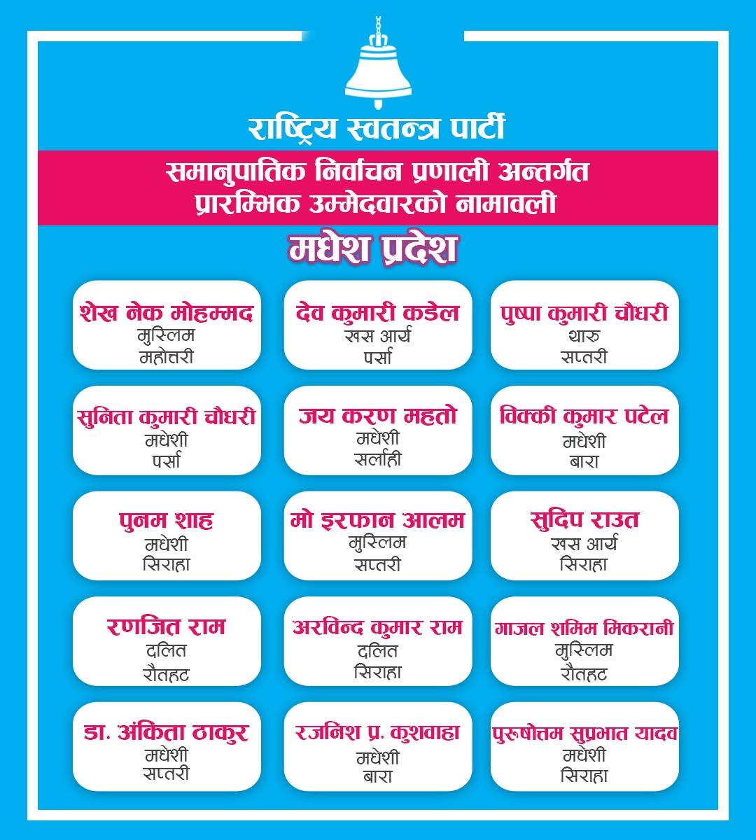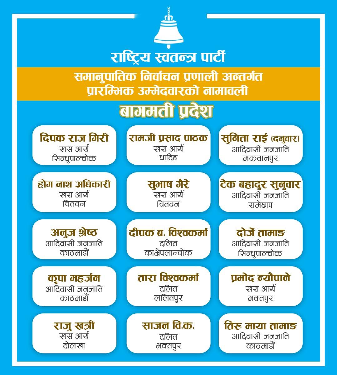 काठमाडौं। राष्ट्रिय स्वतन्त्र पार्टी (रास्वपा) बाट प्रतिनिधि सभाको समानुपातिक तर्फको उम्मेदवार हुनका लागि मंसिर मसान्तसम्म ३२५ जनाको आवेदन परेको छ।