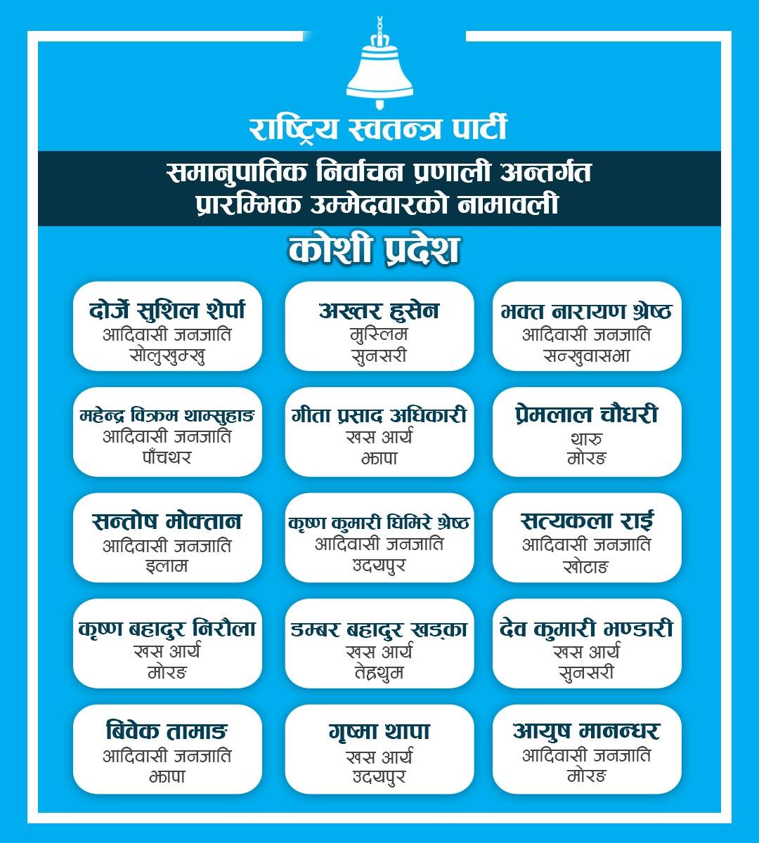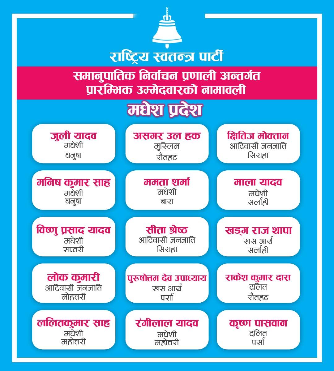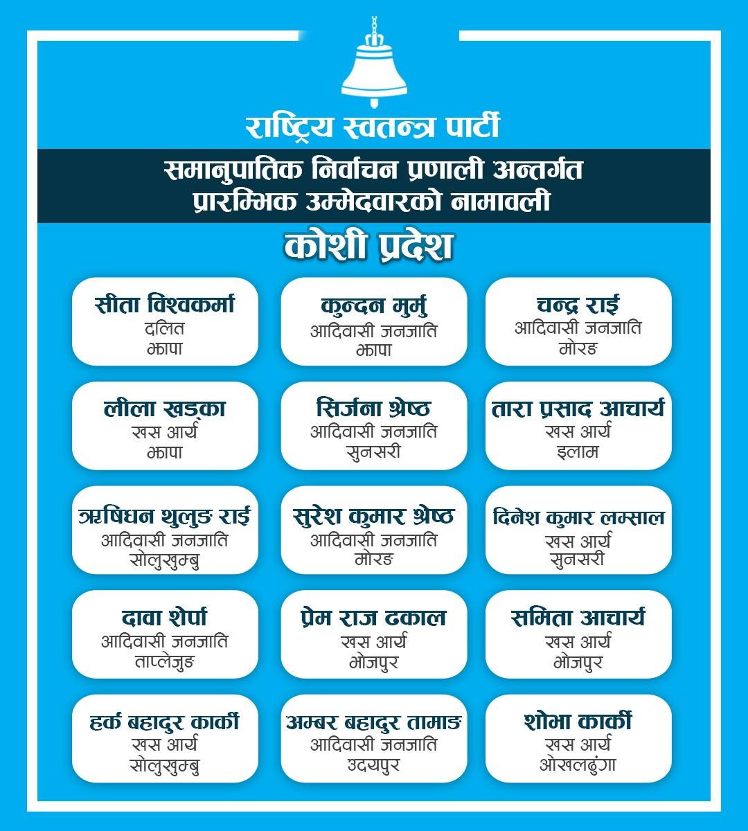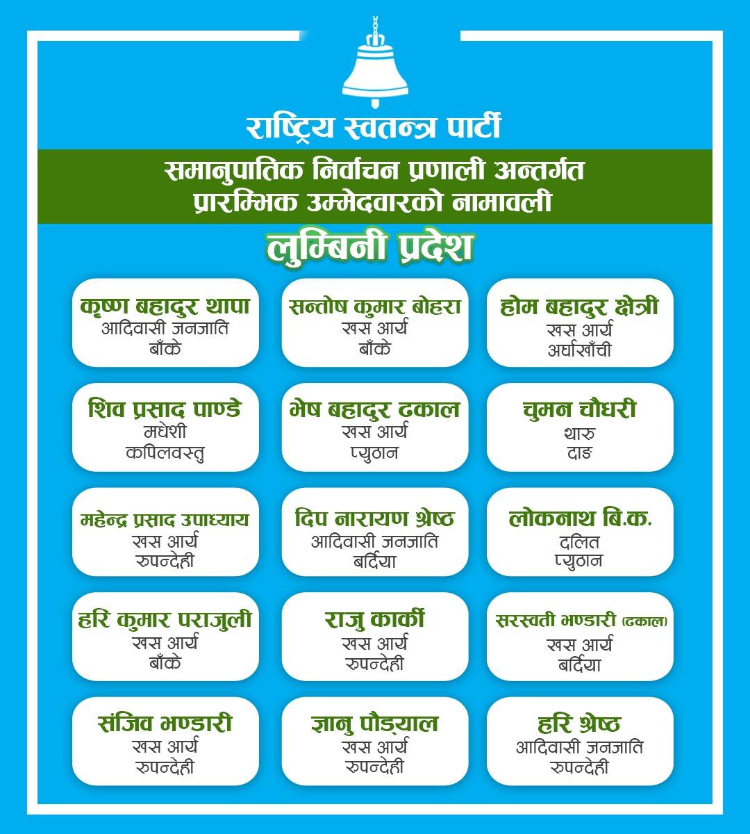 काठमाडौं। राष्ट्रिय स्वतन्त्र पार्टी (रास्वपा) बाट प्रतिनिधि सभाको समानुपातिक तर्फको उम्मेदवार हुनका लागि मंसिर मसान्तसम्म ३२५ जनाको आवेदन परेको छ।