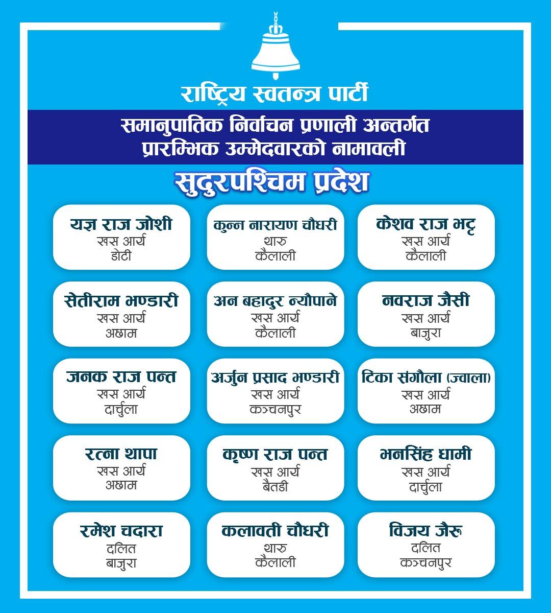 कर्णाली प्रदेशमा हरि ढकाल, बिनिता कठायत र मदन खड्का र सुदूरपश्चिममा दिपकराज बोहरा, ध्रुव गिरी, प्रकाश विष्ट रहेका छन् ।