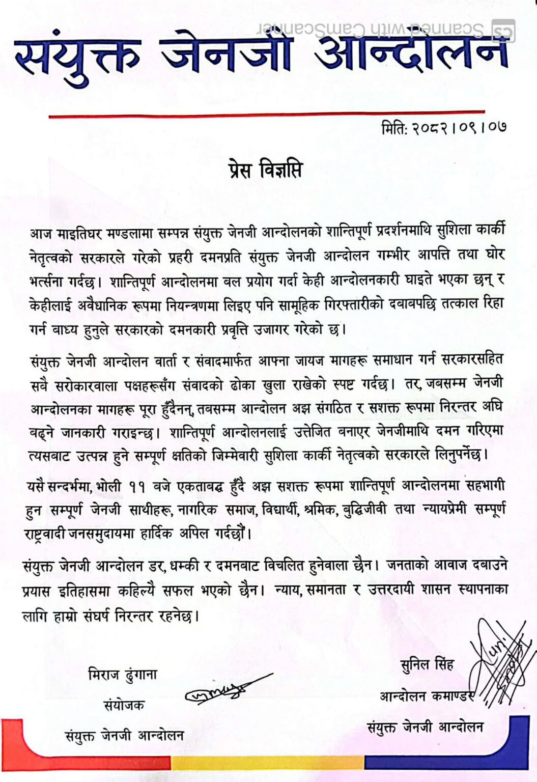 शान्तिपूर्ण आन्दोलनलाई उत्तेजित बनाएर जेनजीमाथि दमन गरिएमा त्यसबाट उत्पन्न हुने सम्पूर्ण क्षतिको जिम्मेवारी सुशीला कार्की नेतृत्वको सरकारले लिनुपर्ने पनि संयुक्त जेनजी आन्दोलनको चेतावनी छ। आन्दोलन भोलि विहान ११ बजे एकताबद्ध हुँदै अझ सशक्त हुने भन्दै ढुंगाना र सिंहले सहभागी हुनको लागि सबैसँग अपिल गरिएकाे छ।