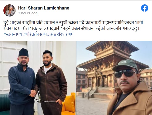 बालेनको राजीनामापछि काठमाडौंको मेयर को बन्ला भन्ने चासोका बीच रास्वपा सभापति रवि लामिछानेका दाजु हरिशरण लामिछानेले सामाजिक संजालमार्फत आफू काठमाडौं महानगरको मेयर पदमा उम्मेदवार बन्ने प्रबल सम्भावना रहेको बताएका छन् । उनको यो भनाइलाई अर्थपूर्ण रुपमा हेरिएको छ ।