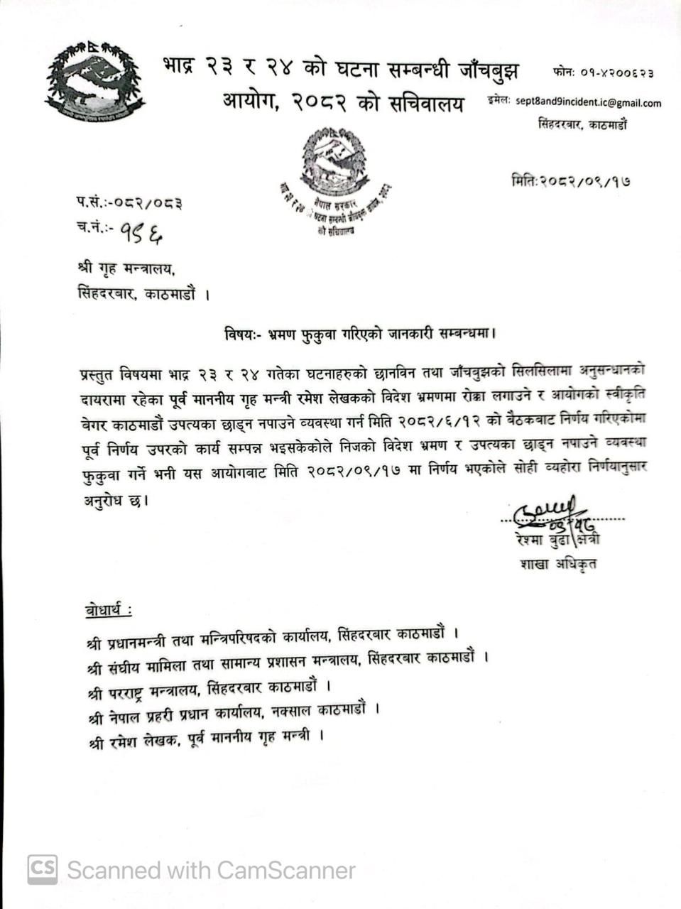 काठमाडौं । भदौ २३ र २४ गतेको घटना सम्बन्धी जाँचबुझ आयोगले तत्कालीन गृहमन्त्री रमेश लेखकको स्थान हद फुकुवा गरेको छ।