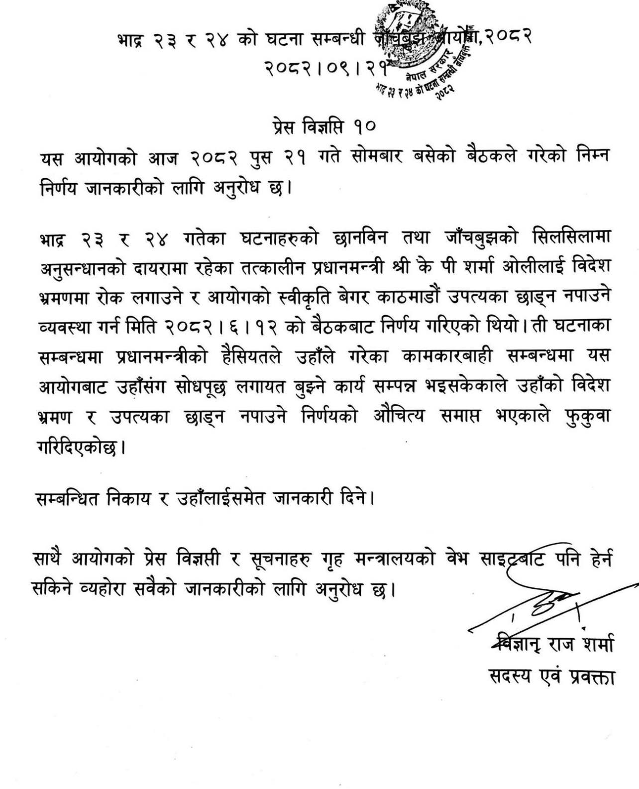 भदौ २३ र २४ गतेको आन्दोलनका घटनाको छानबिन तथा जाँचबुझ आयोगले ओलीलाई अनुमति बिना काठमाडौं उपत्यका छाड्न र विदेश जान रोक लगाएकोमा अब सो स्थान हद फुकुवा गरेको हो।
