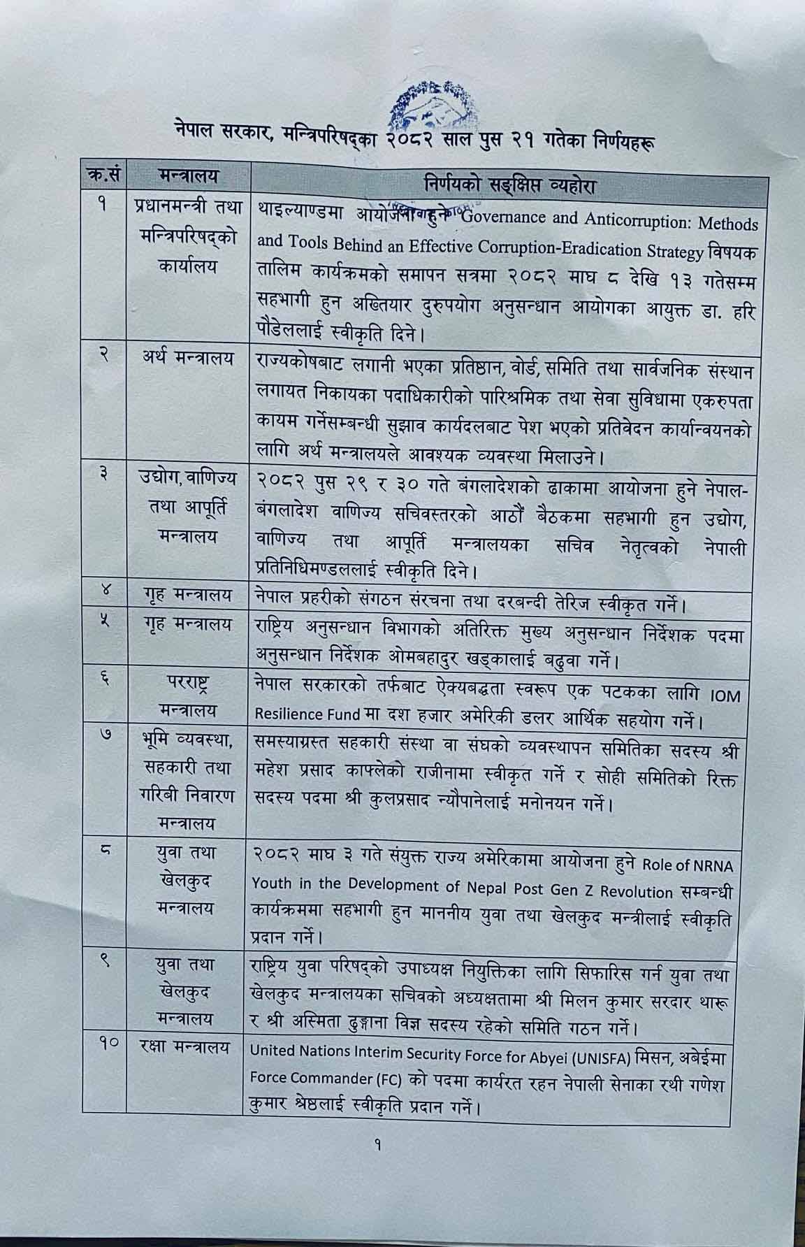 त्यस्तै मन्त्रिपरिषद्ले माघ ३ गते अमेरिकामा आयोजना हुने रोल अफ एनआरएनए युथ इन डेभलपमेन्ट अफ नेपाल पोस्ट जेनजिओ रिभोलुसन सम्बन्धी कार्यक्रममा सहभागी हुन युवा तथा खेलकुद मन्त्रीलाई स्वीकृति प्रदान गर्ने निर्णय भएको गरेको छ भने नेपाली सेना सैनिक साधारण सेवाका दुई जना महासेनानीलाई सोहि सेवाको सहायक रथी दर्जामा र चार जना प्रमुख सेनानीहरूलाई महासेनानी दर्जामा बढुवा गर्ने निर्णय गरेको छ।