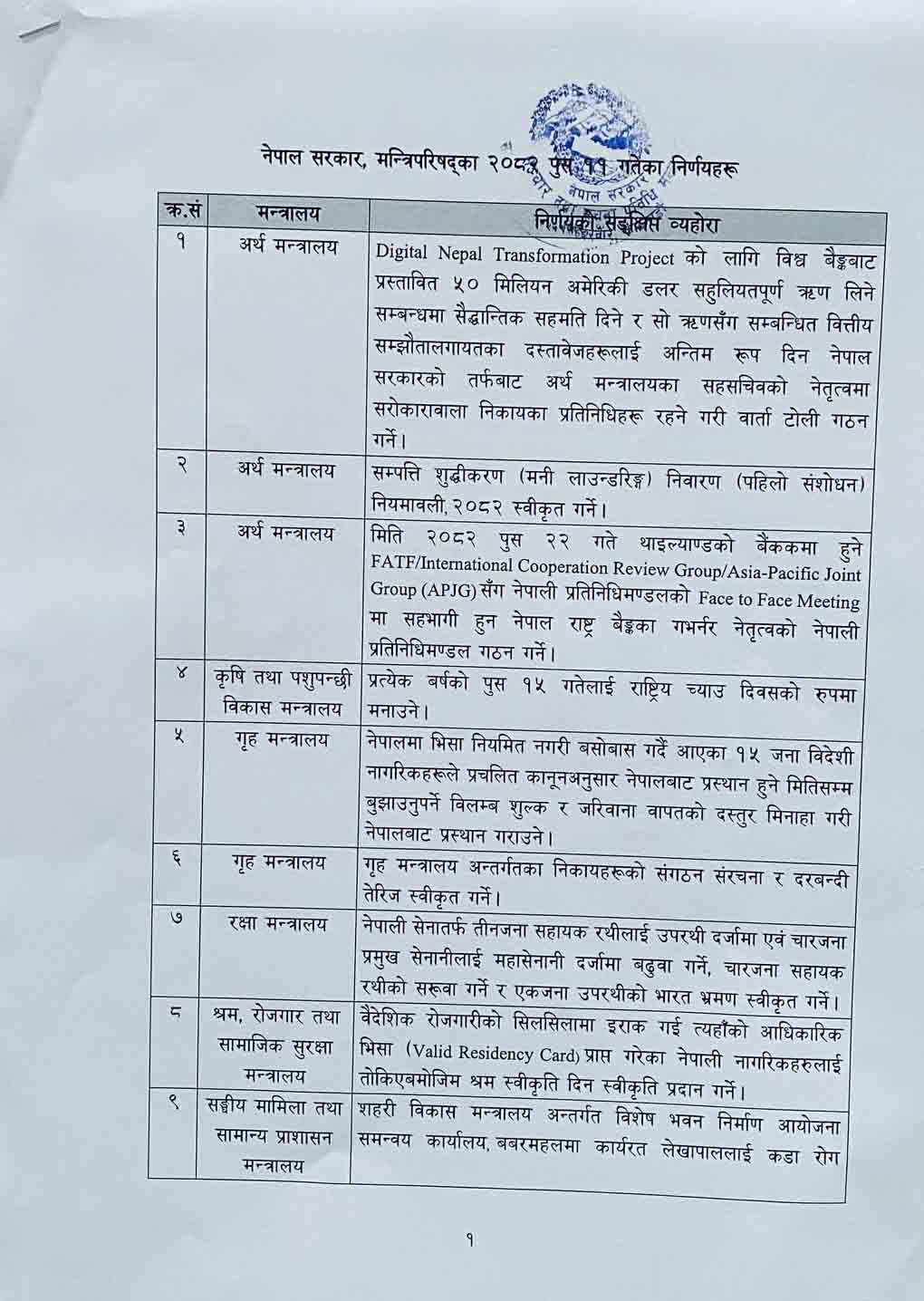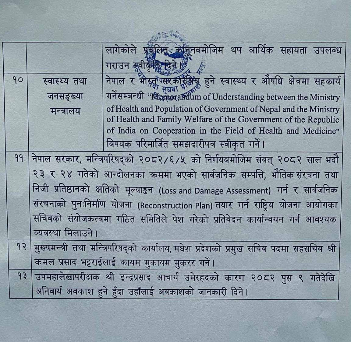 बैठकले पुस २९ र ३० गते बङ्ग्लादेशको ढाकामा आयोजना हुने नेपाल बङ्ग्लादेश वाणिज्य सचिव स्तरको आठौं बैठकमा सहभागी हुन उद्योग, वाणिज्य तथा आपूर्ति मन्त्रालयका सचिव नेतृत्वको नेपाली प्रतिनिधिमण्डललाई स्वीकृति दिने निर्णय गरेको छ भने प्रहरीको सङ्गठन, संरचना तथा दरबन्दी त्यारी स्वीकृत गर्ने निर्णय भएको छ।