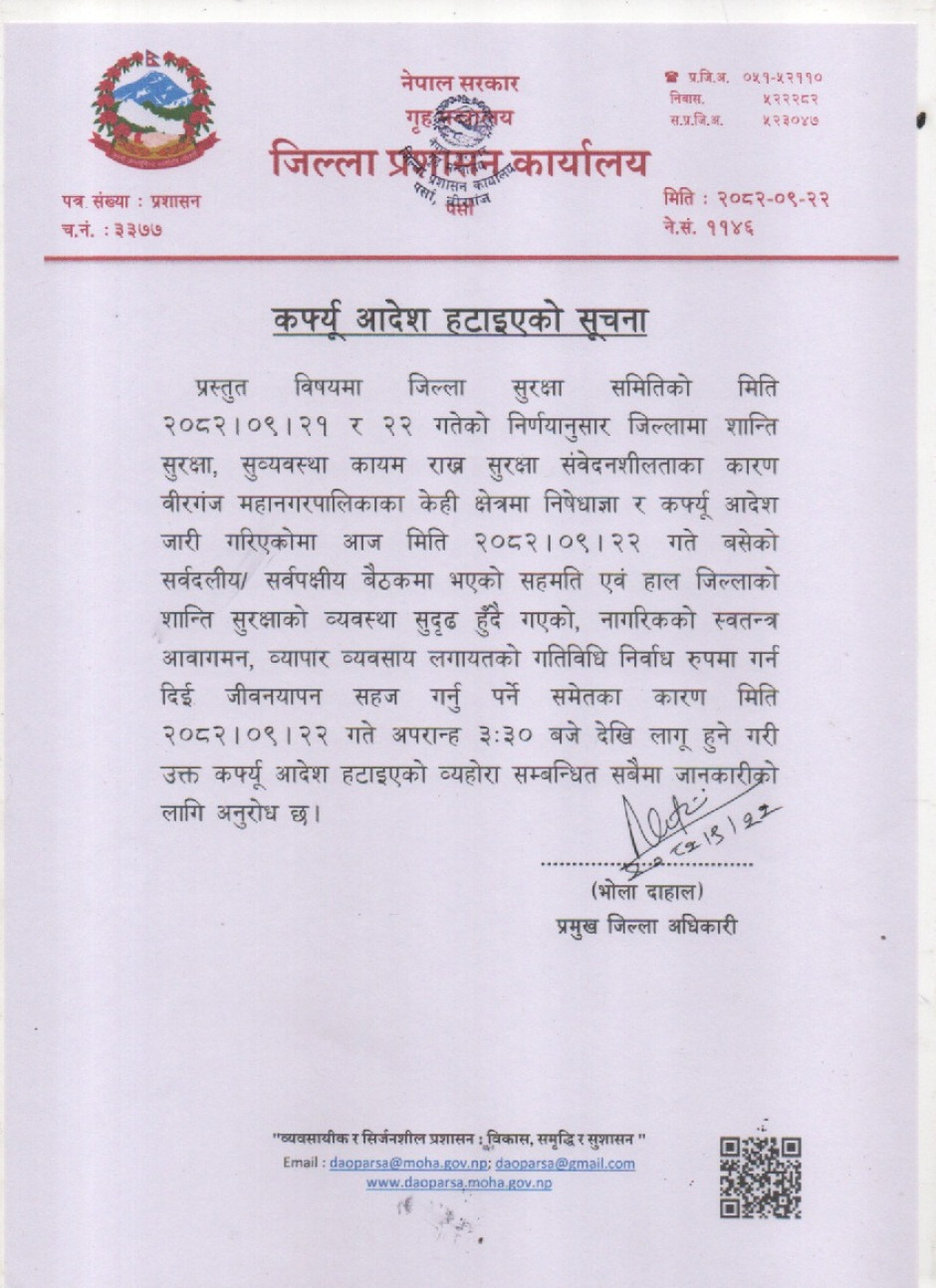 ‘सर्वदलीय र सर्वपक्षीय बैठकमा भएको सहमति एवं हाल जिल्लाको शान्ति सुरक्षाको व्यवस्था सुदृढ हुँदै गएको, नागरिकको स्वतन्त्र आवागमन, व्यापार व्यवसाय लगायतको गतिविधि निर्बाध रूपमा गर्न दिई जीवनयापन सहज गर्नु पर्ने समेतका कारण मिति २०८२।०९।२२ गते अपराह्न ३:३० बजे देखि लागू हुने गरी उक्त कर्फ्यू आदेश हटाइएको ब्यहोरा सम्बन्धित सबैमा जानकारीको लागि अनुरोध छ,’ प्रमुख जिल्ला अधिकारी दाहालले जारी गरेको सूचनामा उल्लेख छ।