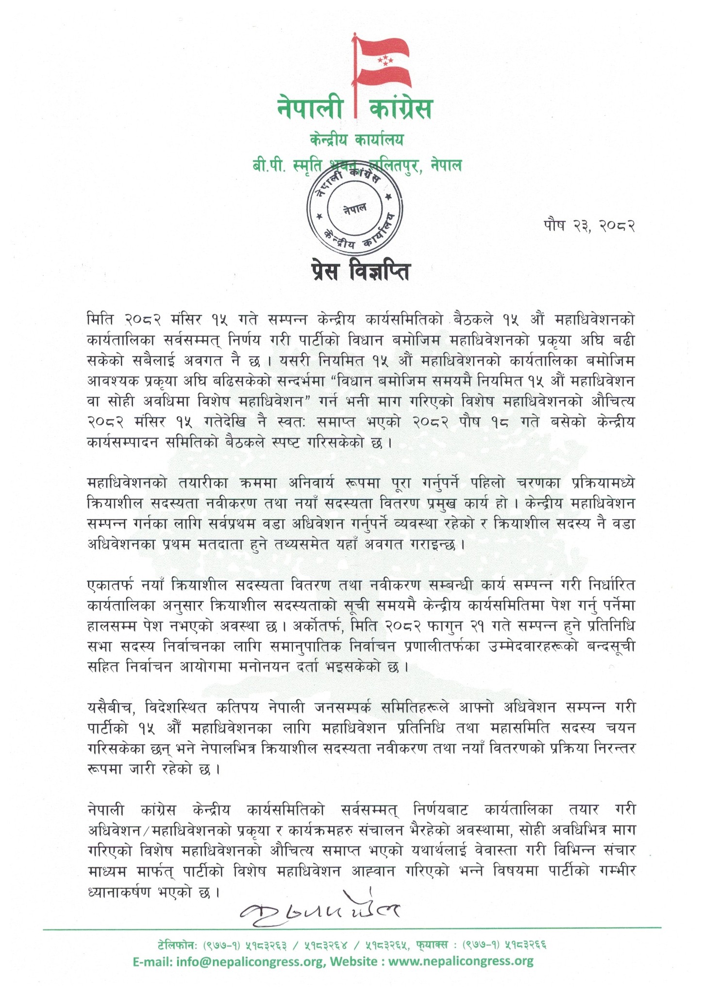 केन्द्रीय कार्यालयका मुख्यसचिव कृष्णप्रसाद पौडेलले जारी गरेको विज्ञप्तिमा भनिएको छ, ‘नेपाली कांग्रेस केन्द्रीय कार्यसमितिको सर्वसम्मत् निर्णयबाट कार्यतालिका तयार गरी अधिवेशन/ महाधिवेशनको प्रकृया र कार्यक्रमहरु संचालन भैरहेको अवस्थामा, सोही अवधिभित्र माग गरिएको विशेष महाधिवेशनको औचित्य समाप्त भएको यथार्थलाई वेवास्ता गरी विभिन्न संचार माध्यम मार्फत् पार्टीको विशेष महाधिवेशन आह्वान गरिएको भन्ने विषयमा पार्टीको गम्भीर ध्यानाकर्षण भएको छ।’