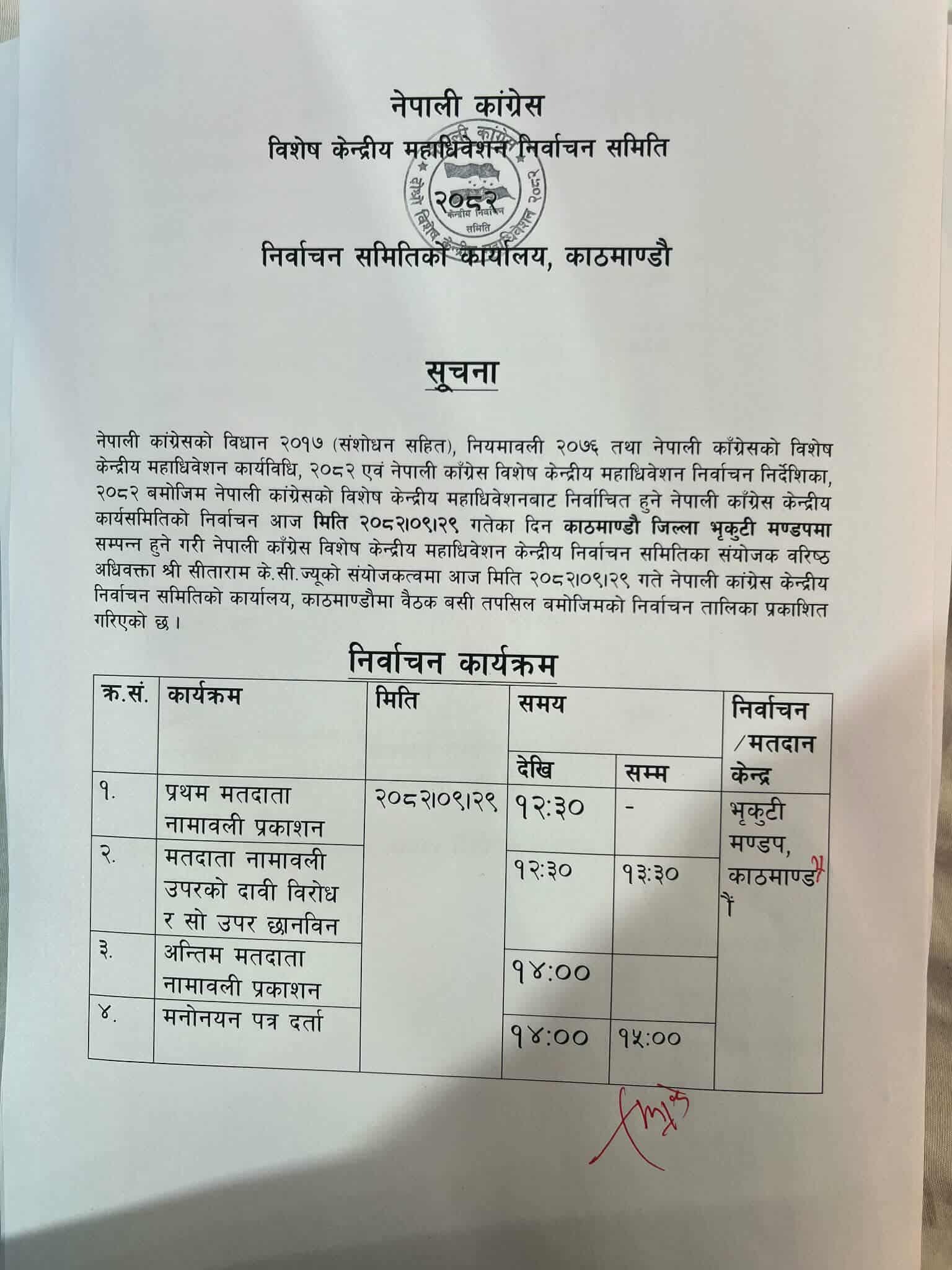 काठमाडौं । नेपाली कांग्रेसको विशेष महाधिवेशनबाट नयाँ नेतृत्व चयनका लागि आज राती ९ बजे मतदान हुने भएको छ । निर्वाचन समितिले निर्वाचन कार्यतालिका सार्वजनिक गर्दै आज राती ९ बजेदेखि मतदान सुरु हुने जनाएको हो ।