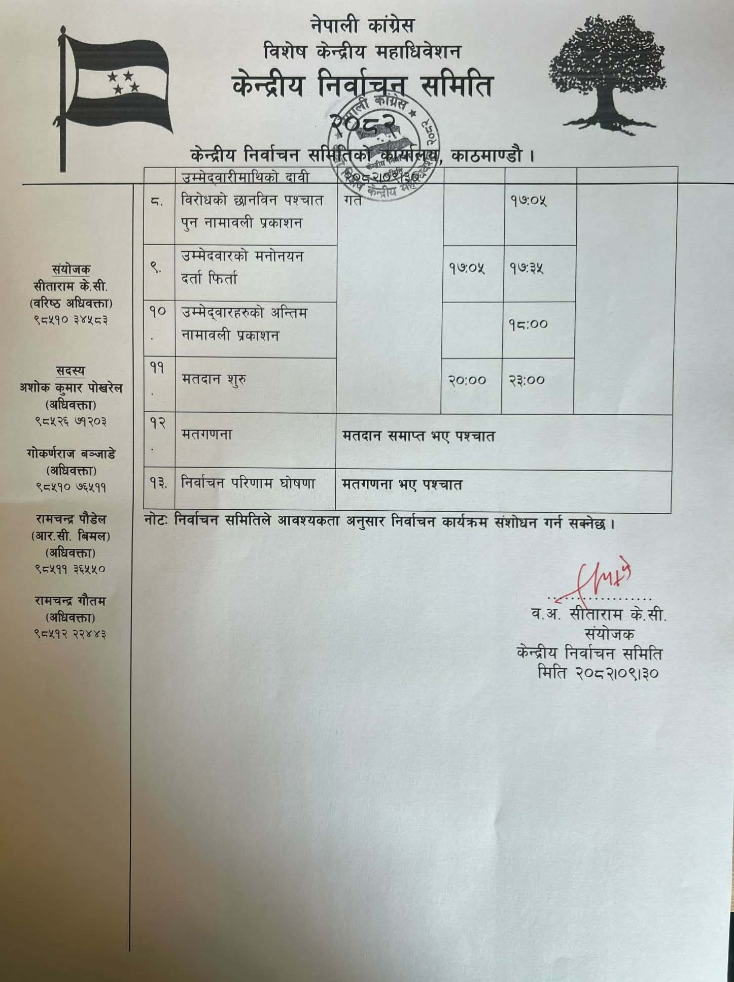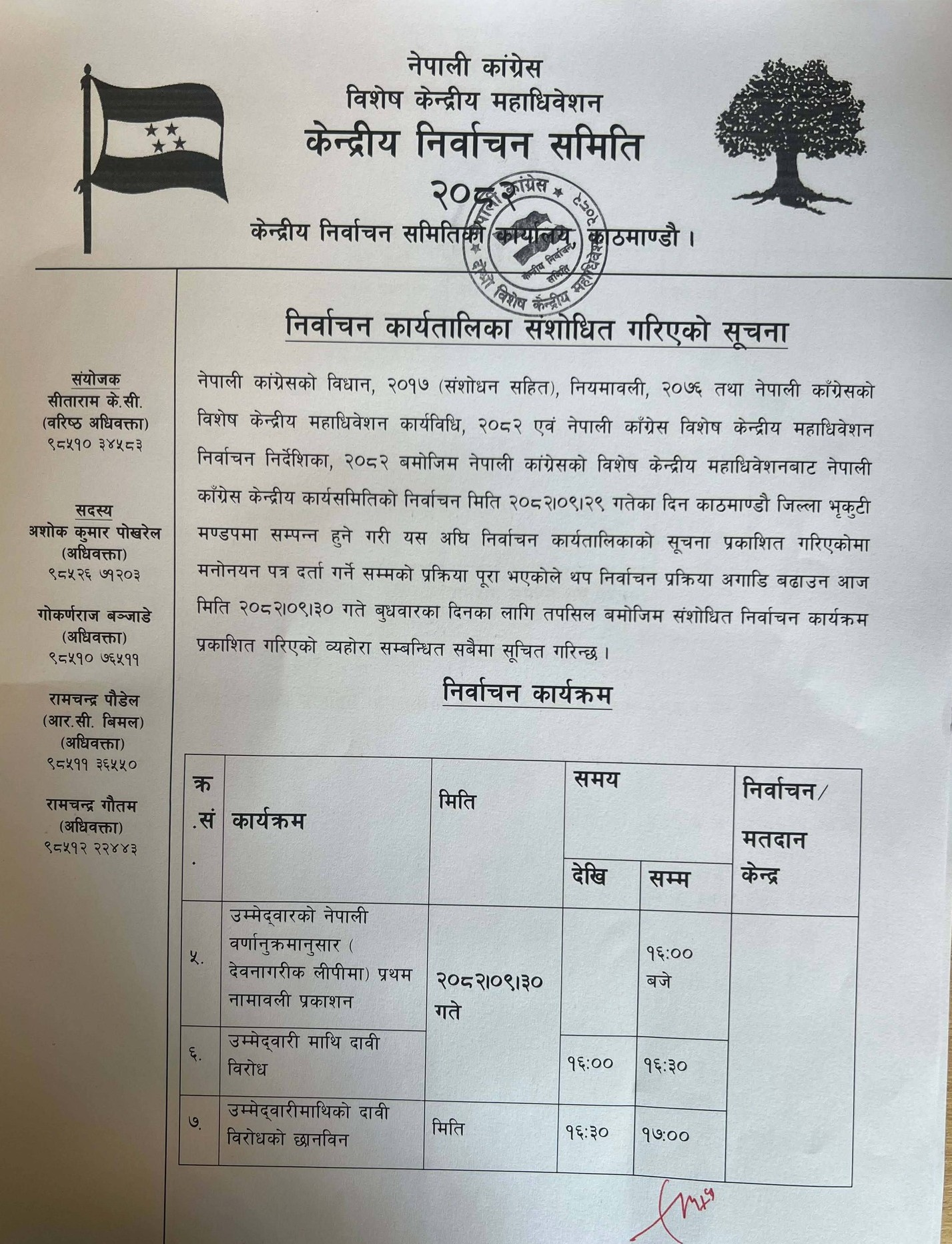 सूचनामा भनिएको छ, ‘यसअघि निर्वाचन कार्यतालिकाको सूचना प्रकाशित भएकोमा मनोनयन पत्र दर्ता गर्नेसम्मको प्रक्रिया पूरा भएकोले थप निर्वाचन प्रक्रिया अगाडि बढाउन आज मिति २०८२/०९/३० गते बुधबारका दिनका लागि तपसिल बमोजिम संशोधित निर्वाचन कार्यक्रम प्रकाशित गरिएको ब्यहोरा सम्बन्धित सबैमा सूचित गरिन्छ।’