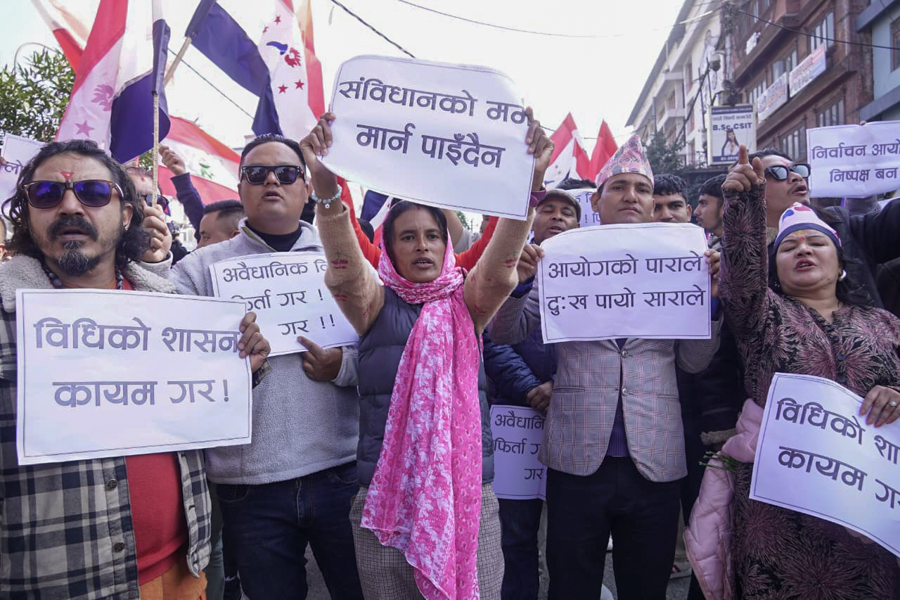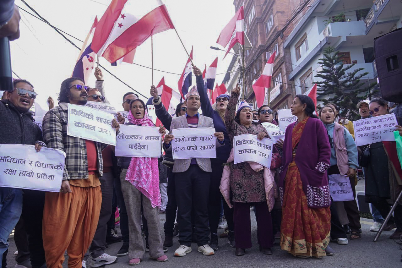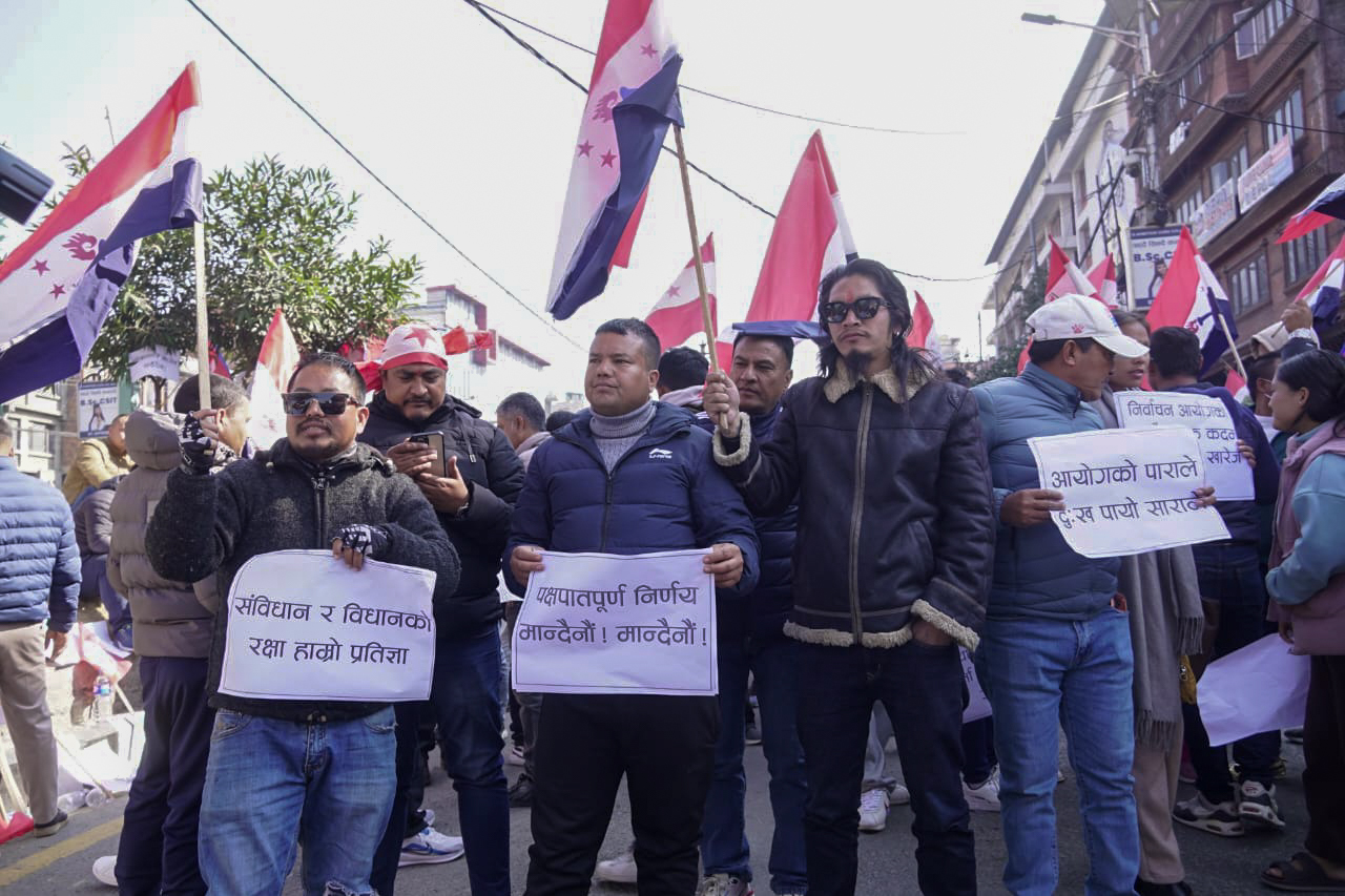काठमाडाैं। निर्वाचन आयोगले गगन पक्षलाई वैधानिकता दिएपछि देउवा पक्षका कार्यकर्ताहरु आन्दोलित भएका छन्। आज माइतीघर मण्डलामा देउवा पक्षका कार्यकर्ताहरुले संविधानको मर्म मार्न पाइँदैन, विधिको शासन कायम गर, अवैधानिक निर्णय फिर्ता गर, कानूनी राज्यको सम्मान गर भन्ने जस्ता नारासहित आन्दोलन गरेका छन्।