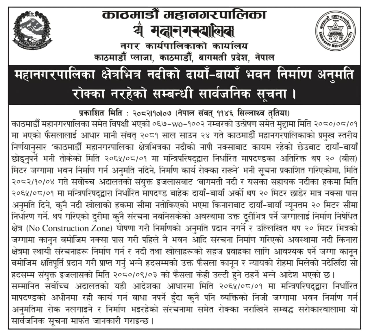 महानगरपालिकाले जारी गरेको सार्वजनिक सूचनाअनुसार, काठमाडौं महानगरपालिका समेत विपक्षी रहेको ०६७–०–१००२ नम्बरको उत्प्रेषणसम्बन्धी मुद्दामा सर्वोच्च अदालतले दिएको पछिल्लो आदेशका आधारमा नदी किनारामा थप २० मिटर क्षेत्रलाई लिएर गरिएको रोक्का अब लागू नहुने जनाएको हो।