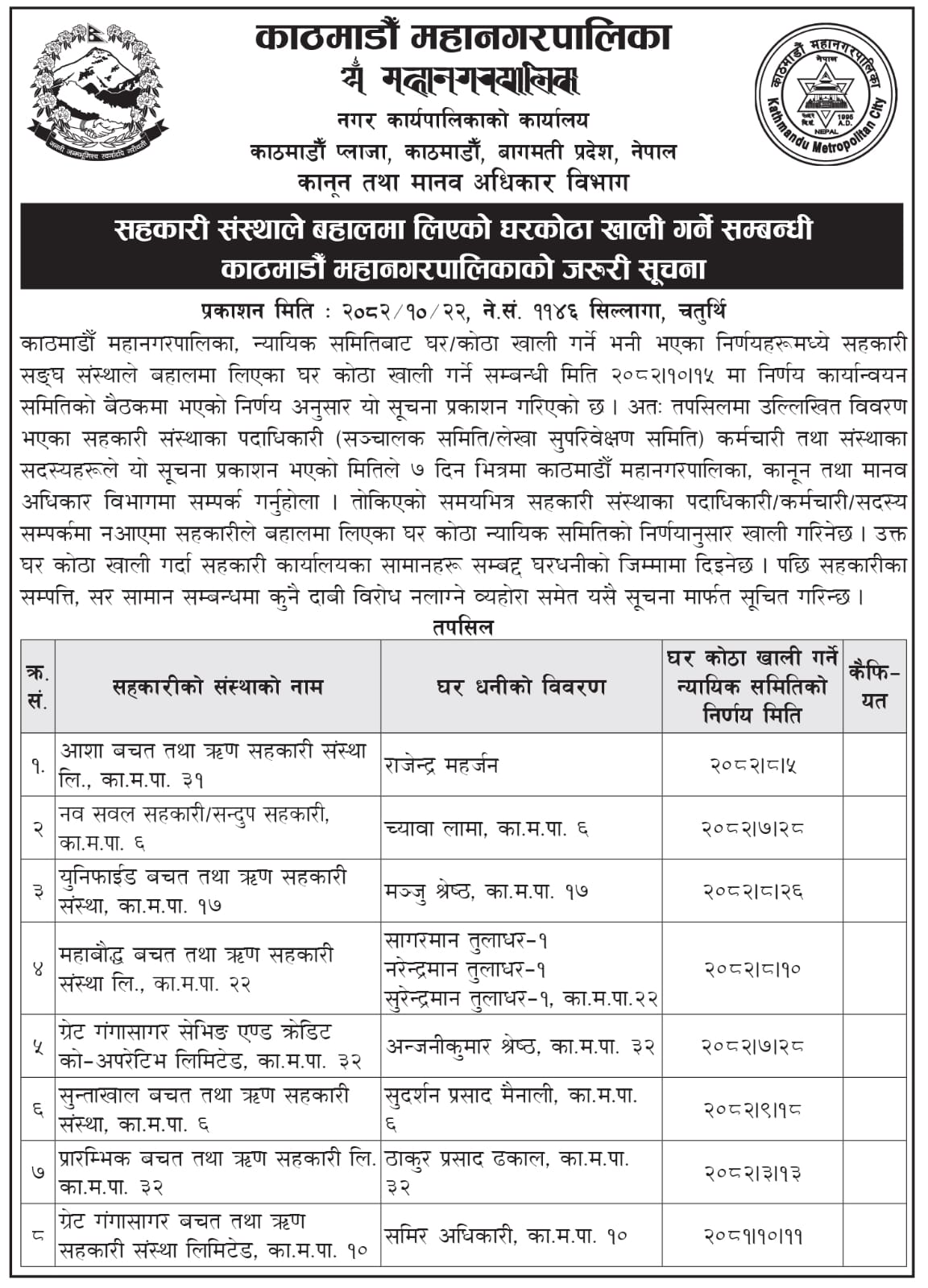 काठमाडौं महानगरपालिका, कानून तथा मानव अधिकार विभागअन्तर्गत न्यायिक समितिबाट घर/कोठा खाली गर्ने भनी भएका निर्णयहरूमध्ये सहकारी संघ–संस्थाले बहालमा लिएका घर–कोठा खाली गर्ने सम्बन्धमा मिति २०८२/१०/१५ मा निर्णय कार्यान्वयन समितिको बैठकले गरेको निर्णयअनुसार उक्त सूचना प्रकाशित गरिएको हो ।