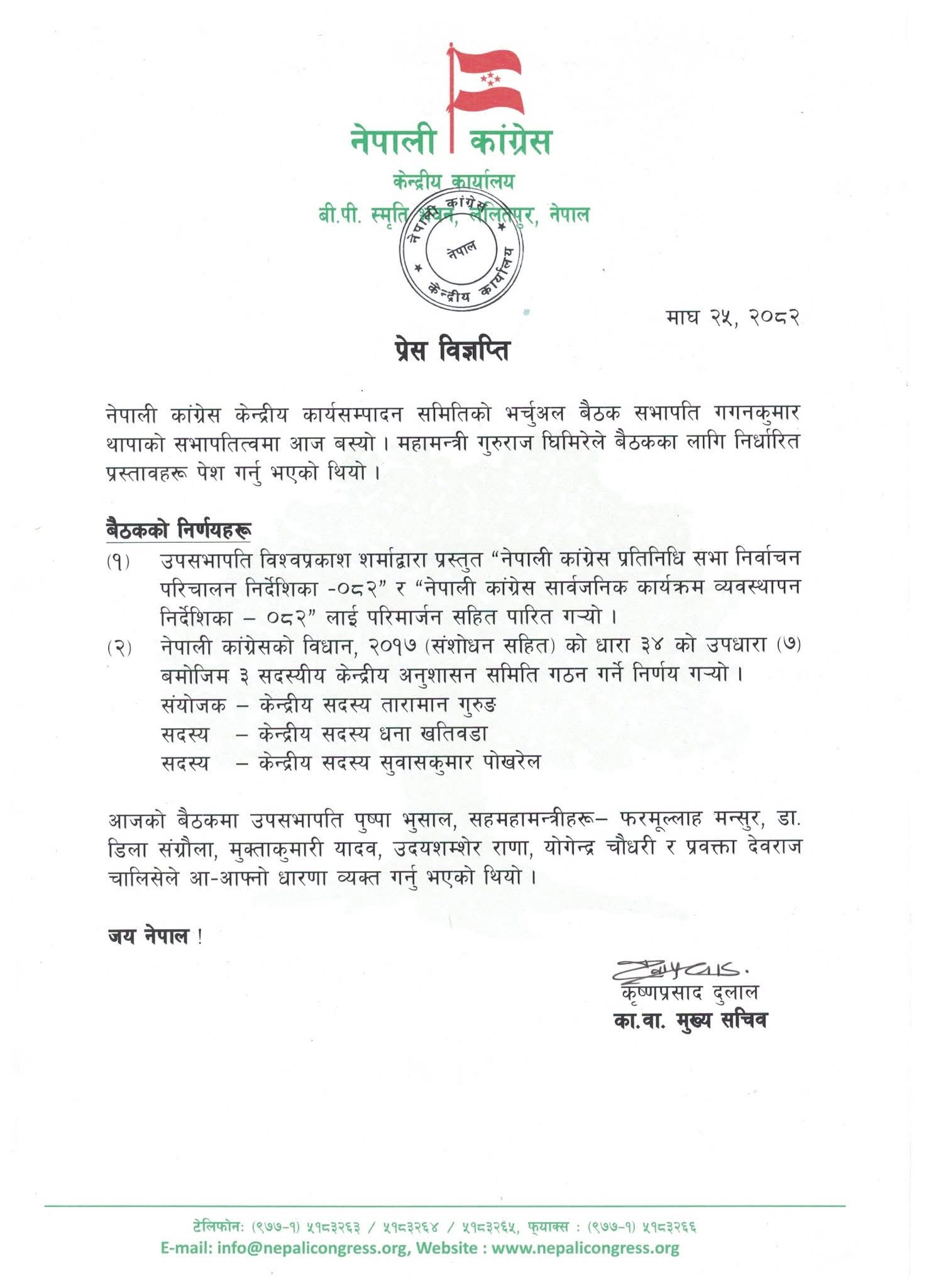 बैठकले उपसभापति विश्वप्रकाश शर्माले प्रस्तुत गरेको ‘नेपाली कांग्रेस प्रतिनिधि सभा निर्वाचन परिचालन निर्देशिका –०८२’ र ‘नेपाली कांग्रेस सार्वजनिक कार्यक्रम व्यवस्थापन निर्देशिका-०८२’ लाई परिमार्जनसहित पारित गरेको प्रवक्ता चालिसेले बताए।