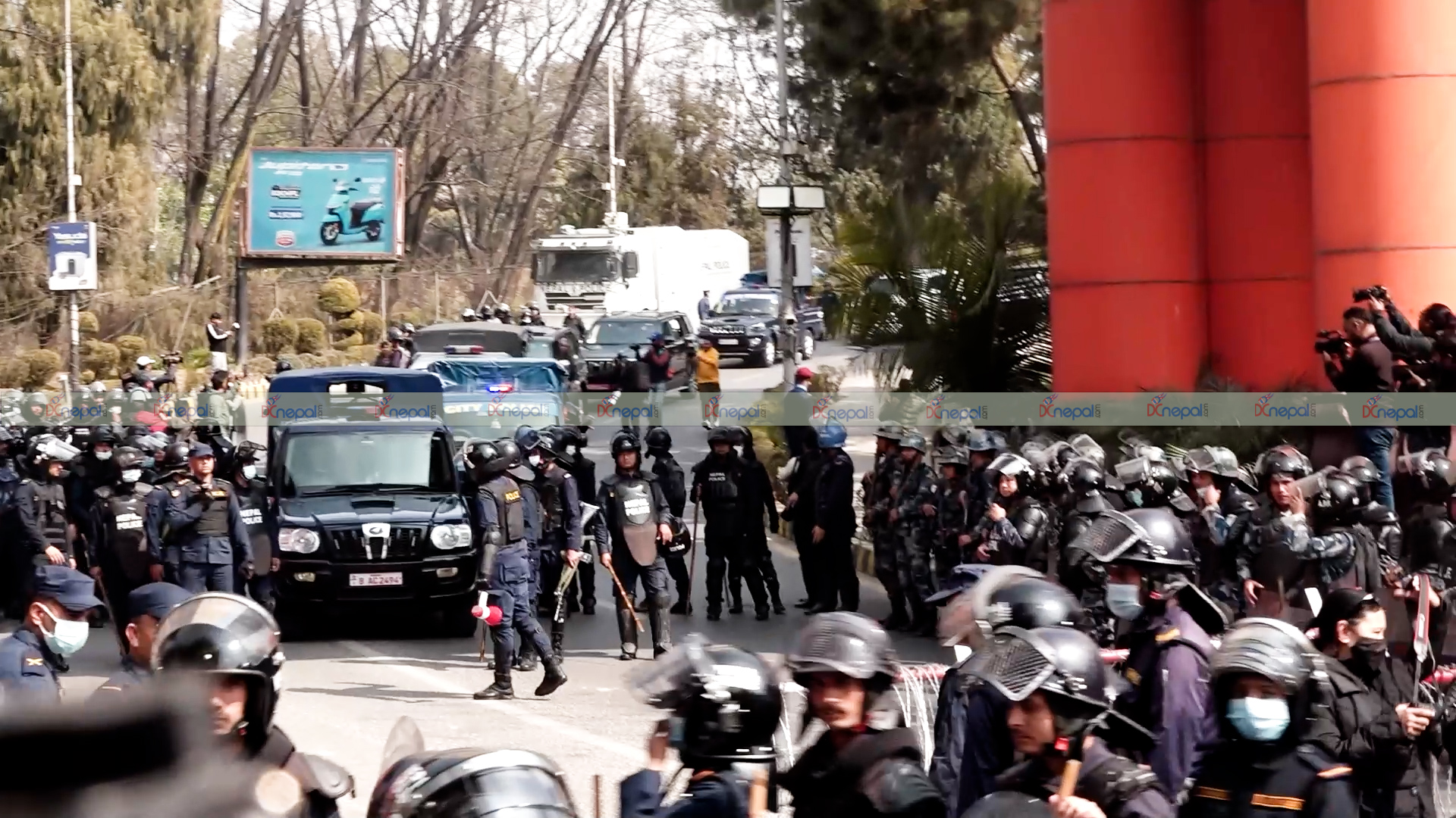 प्रशासनले विमानस्थल क्षेत्रमा निषेधाज्ञा जारी गरेपनि ठूलो संख्यामा राजसंस्था समर्थकहरु स्वागतका लागि पुगेका थिए। उनीहरुले राजसंस्था समर्थित नारा लगाएका थिए। पूर्वराजा शाह शुक्रबार हेलिकप्टरमार्फत झापाबाट काठमाडौं आएका थिए।