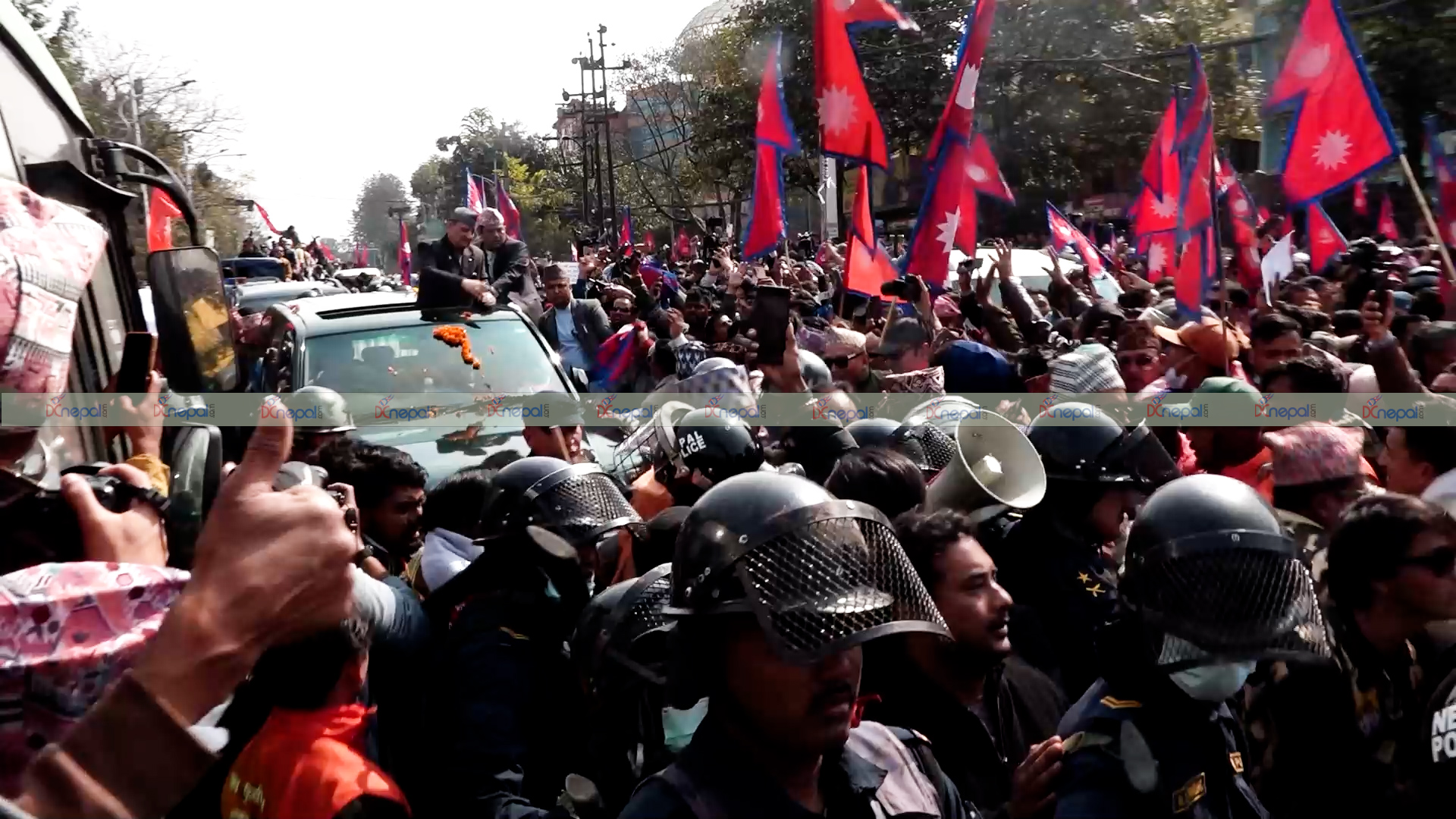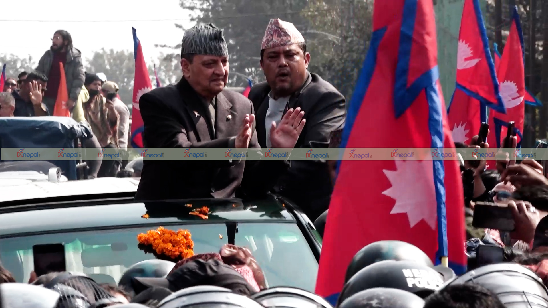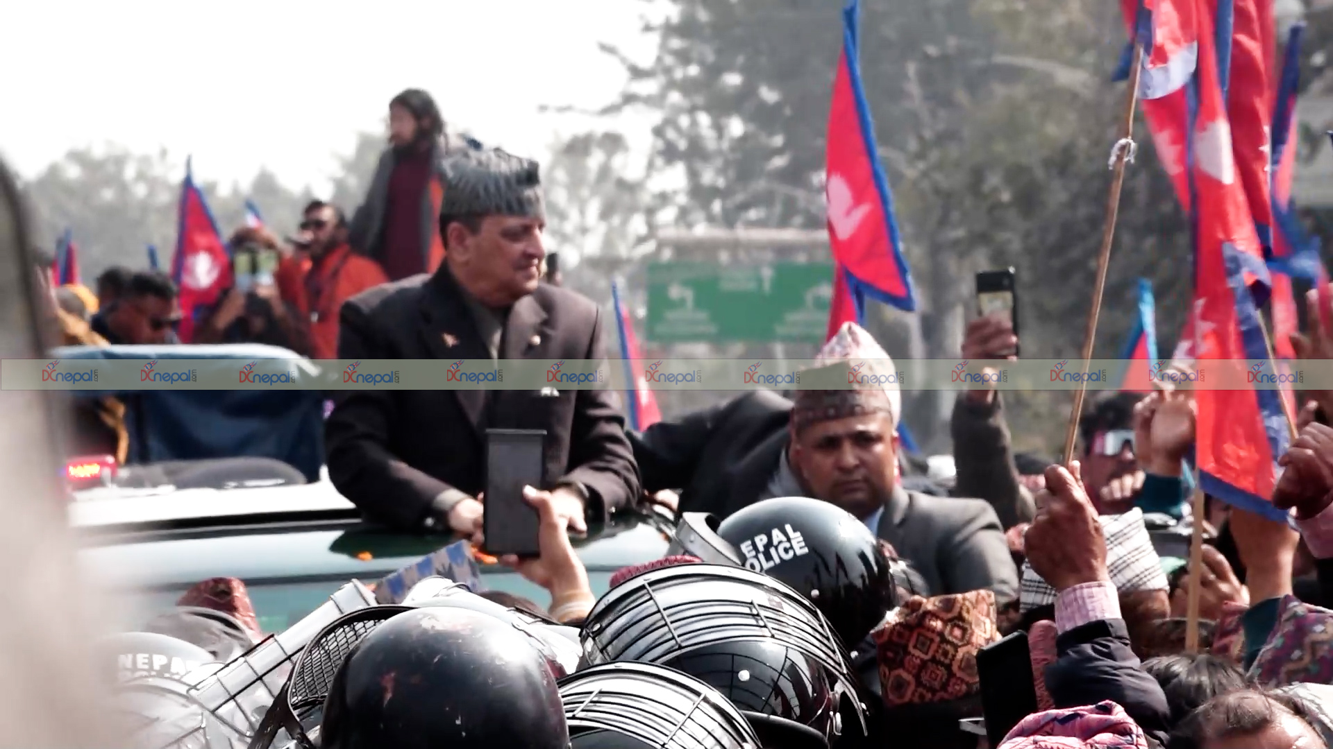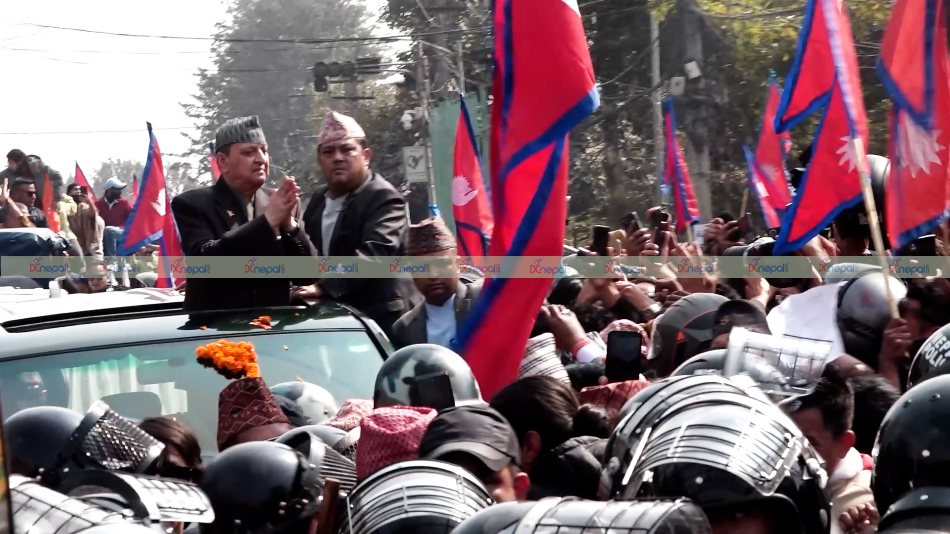 शुक्रबार काठमाडौं फर्किएपछि पूर्वराजा शाहलाई ठूलो संख्यामा उपस्थित भएका समर्थकहरुले बिमानस्थल मुख्य गेट बाहिर स्वागत गरेका हुन्।