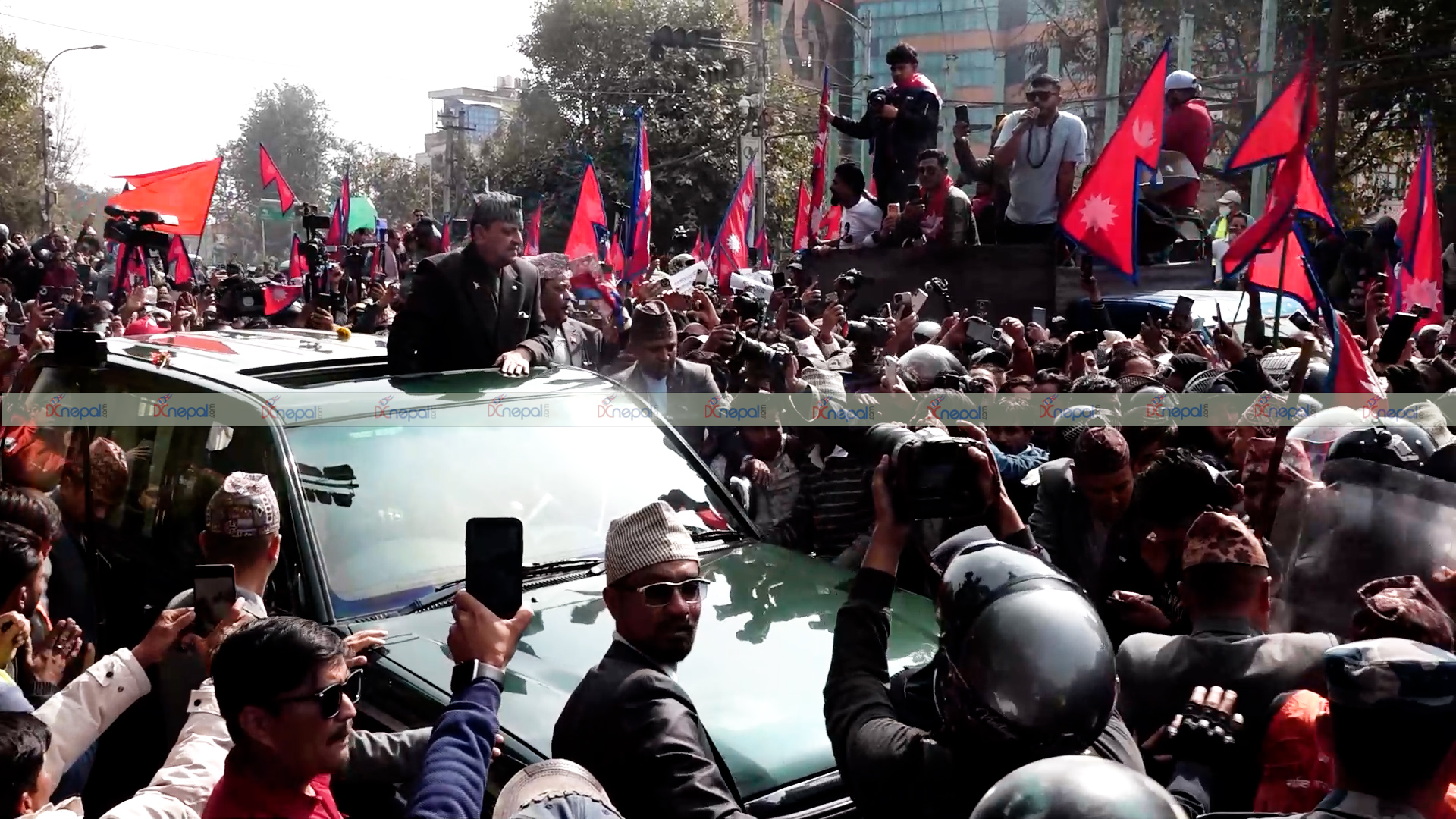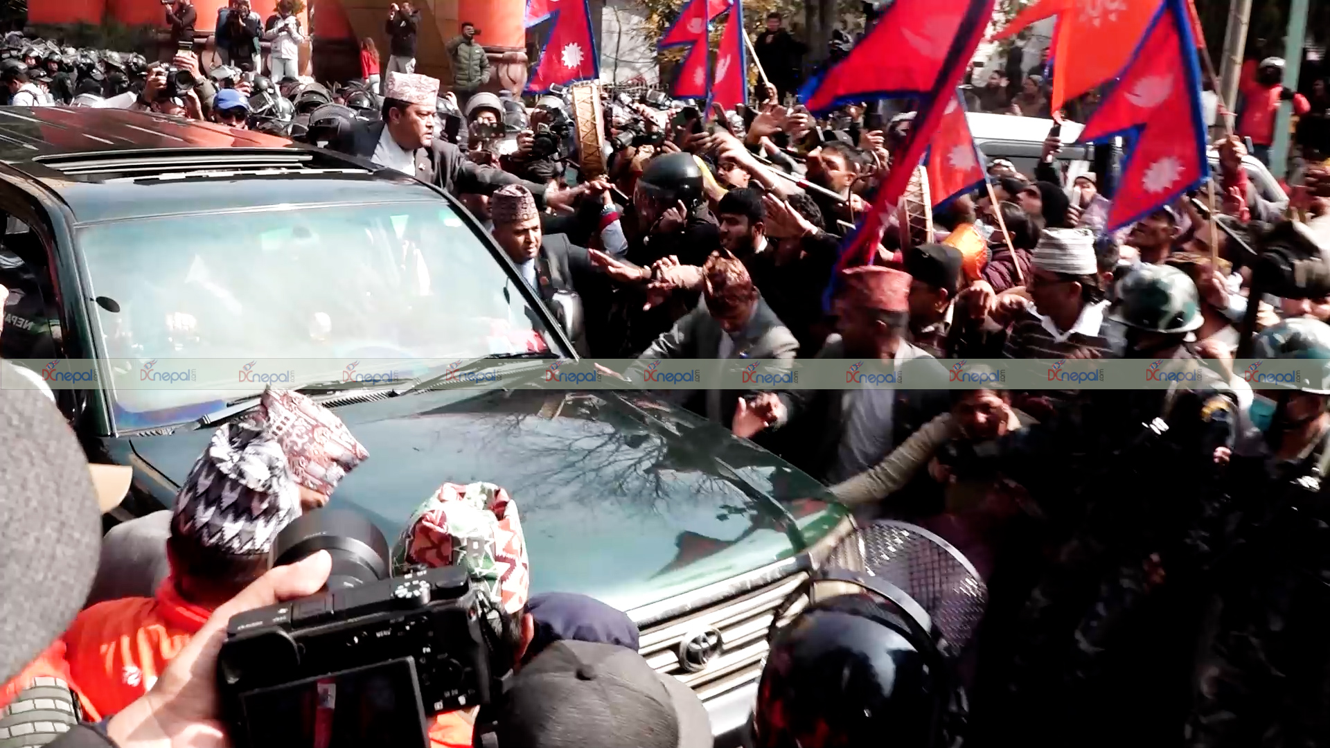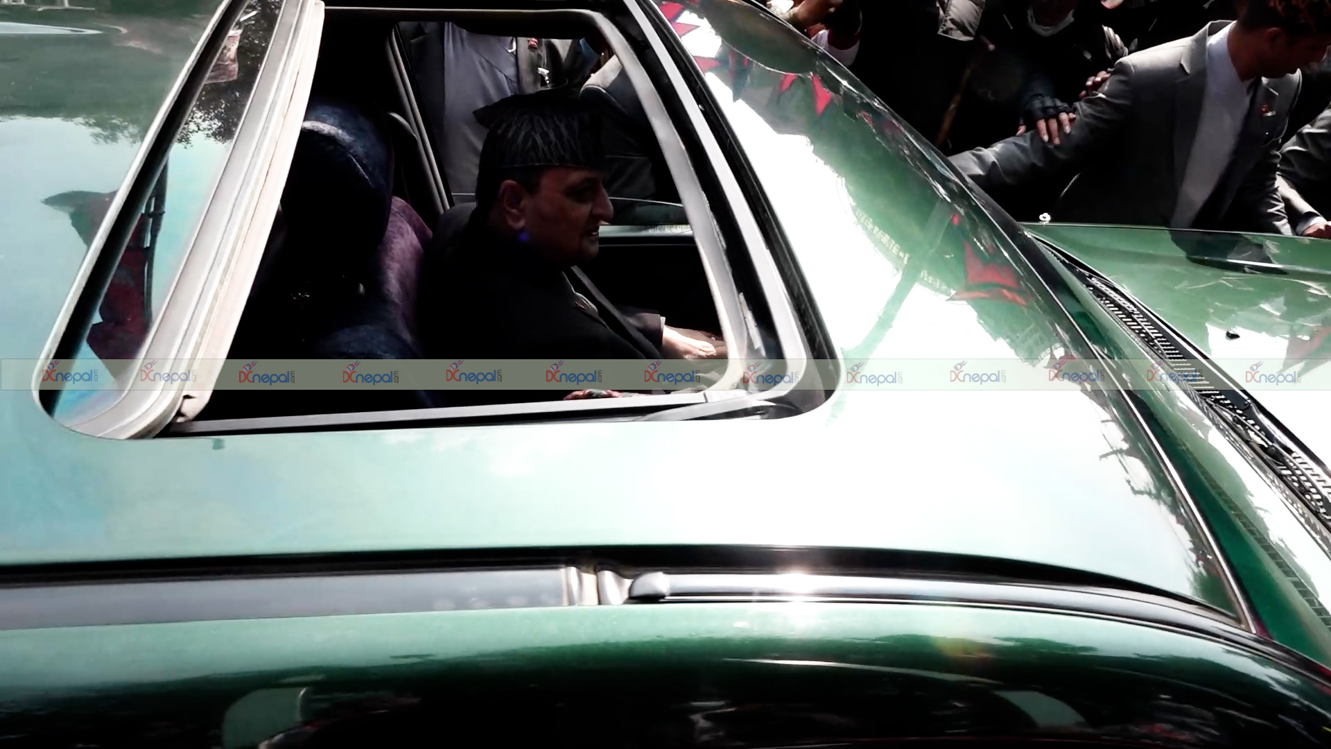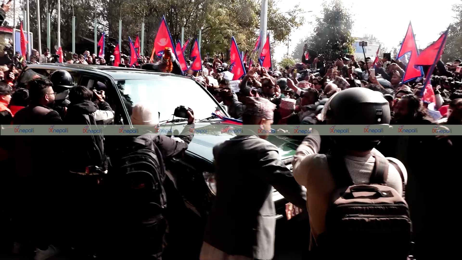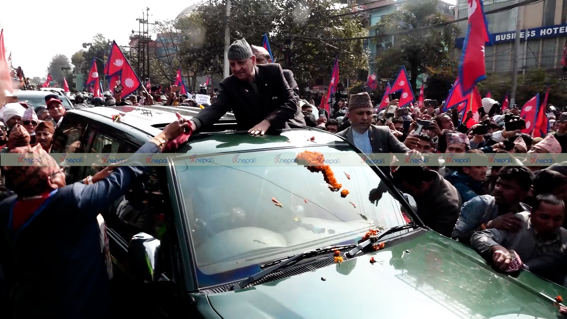 शुक्रबार काठमाडौं फर्किएपछि पूर्वराजा शाहलाई ठूलो संख्यामा उपस्थित भएका समर्थकहरुले बिमानस्थल मुख्य गेट बाहिर स्वागत गरेका हुन्।