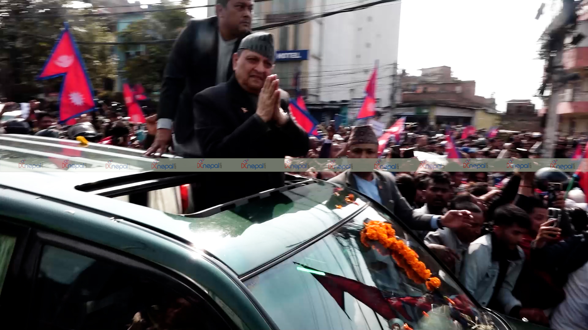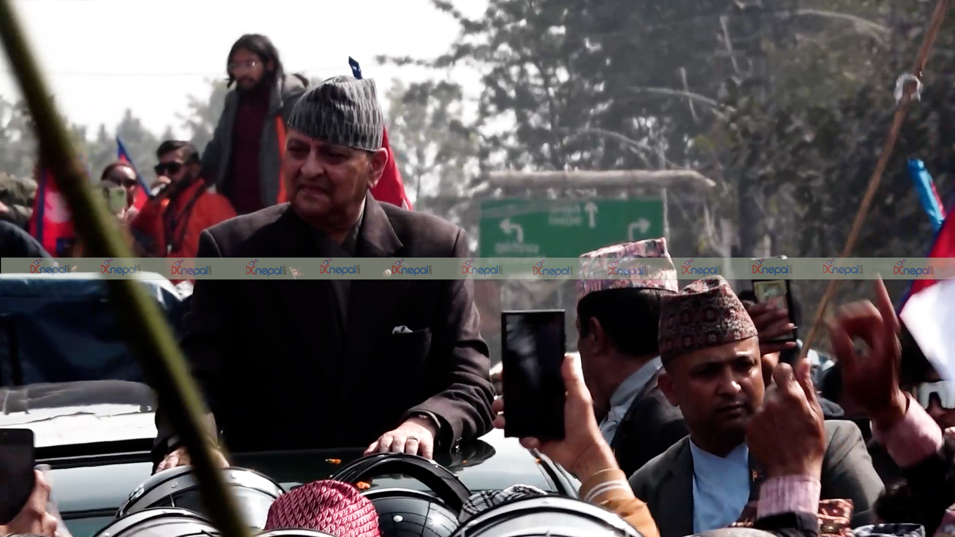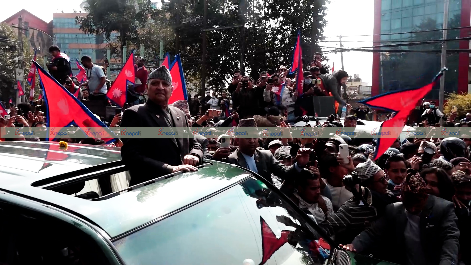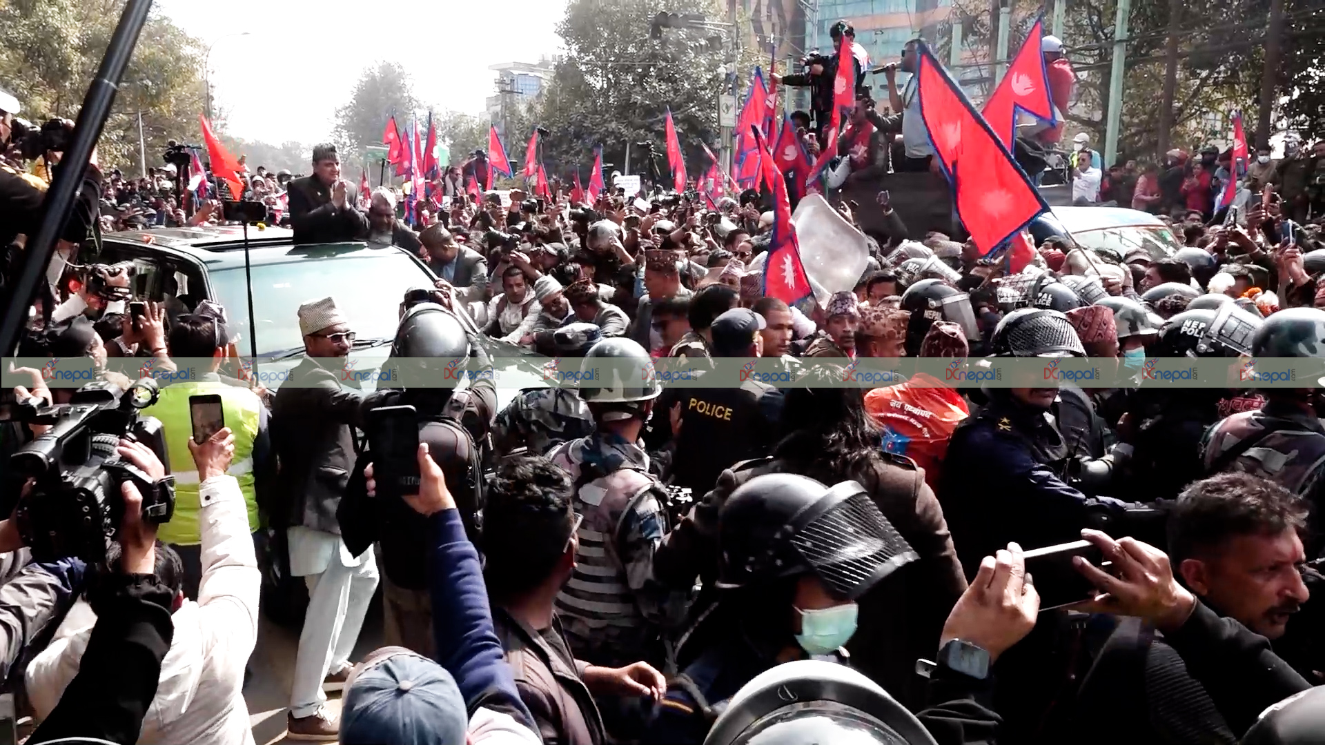 शुक्रबार काठमाडौं फर्किएपछि पूर्वराजा शाहलाई ठूलो संख्यामा उपस्थित भएका समर्थकहरुले बिमानस्थल मुख्य गेट बाहिर स्वागत गरेका हुन्।