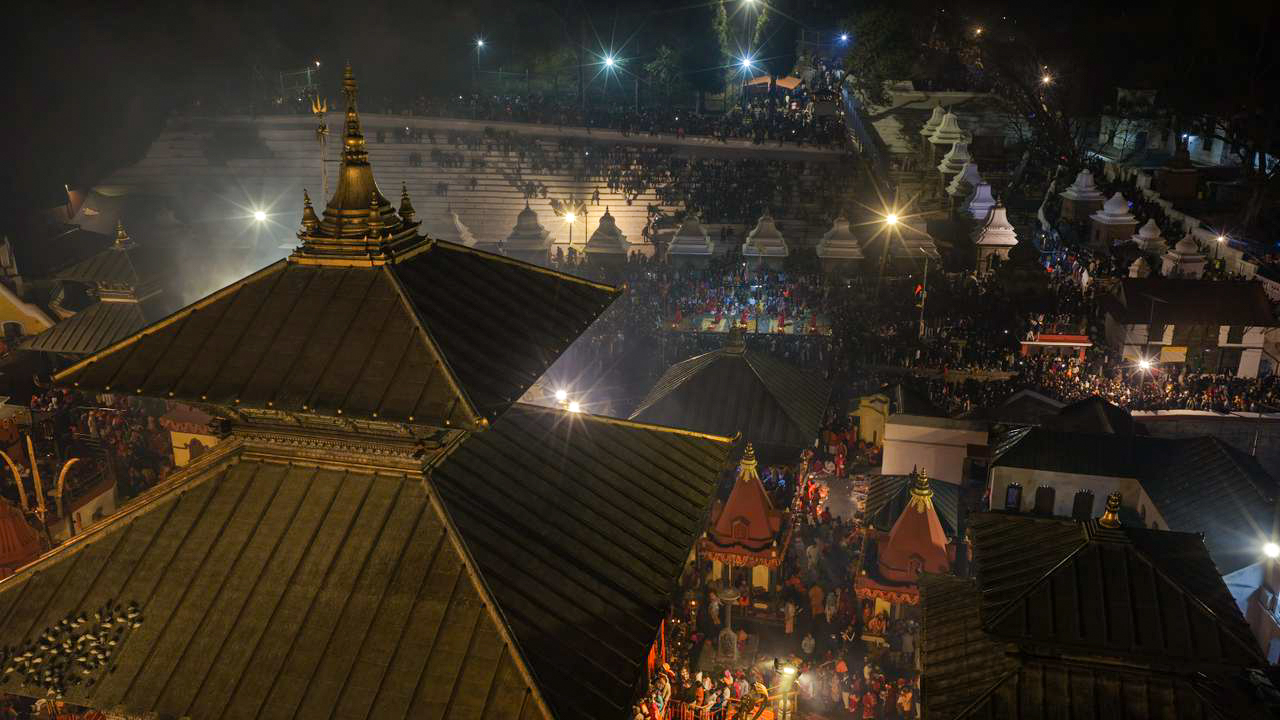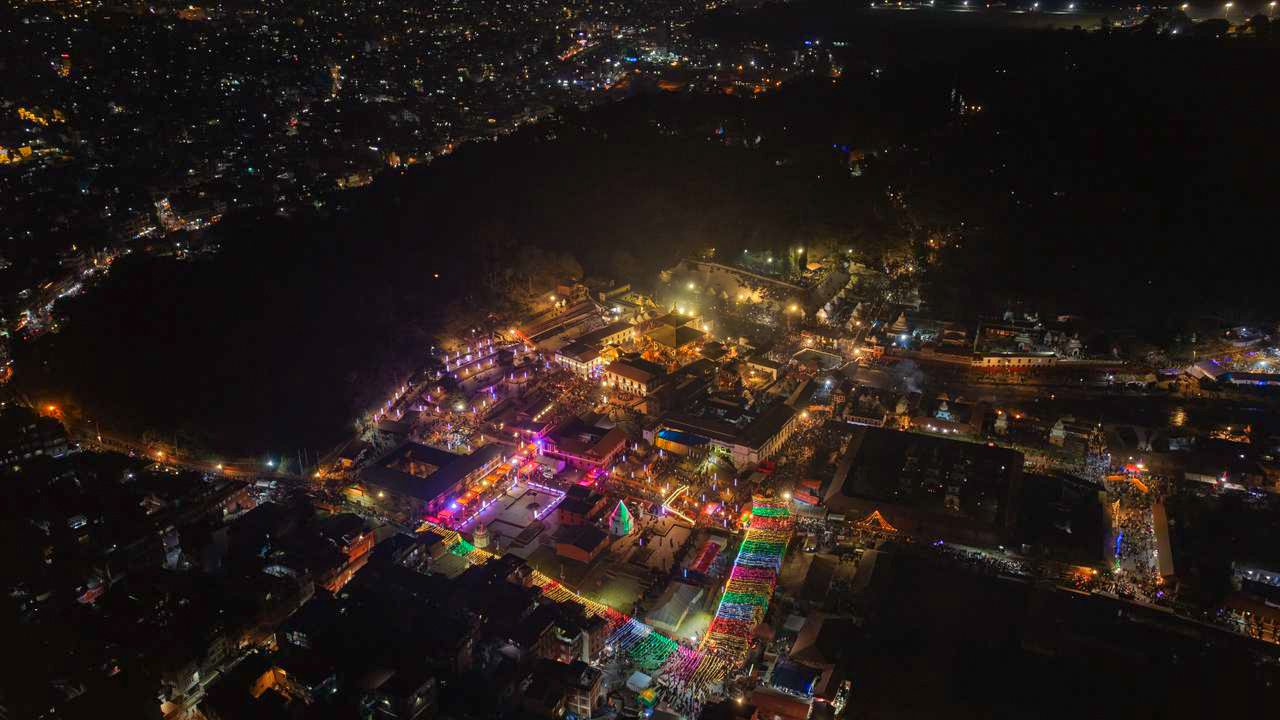 शिवरात्रिको रात, बत्ती र भक्तजनले उज्यालो बनेको पशुपति (ड्रोन दृश्यहरू)