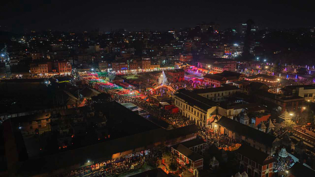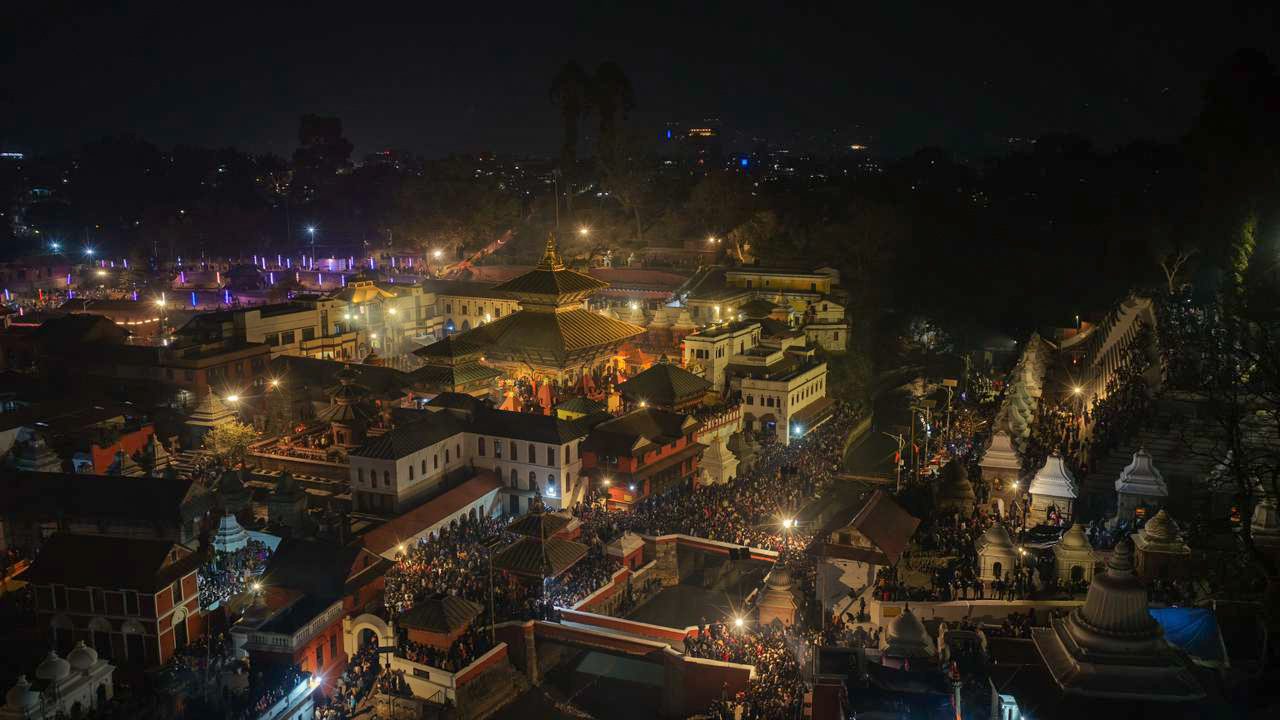 महाशिवरात्रिको अवसरमा पशुपतिनाथ मन्दिर क्षेत्रमा भक्तजनको उल्लेख्य भीड देखिएको छ। रातभर दीप, बत्ती र आरतीले मन्दिर परिसर झिलिमिली बनेको थियो। ड्रोन क्यामेराबाट कैद गरिएको दृश्यमा पशुपति क्षेत्र भक्तिमय वातावरणमा डुबेको देखिन्छ।