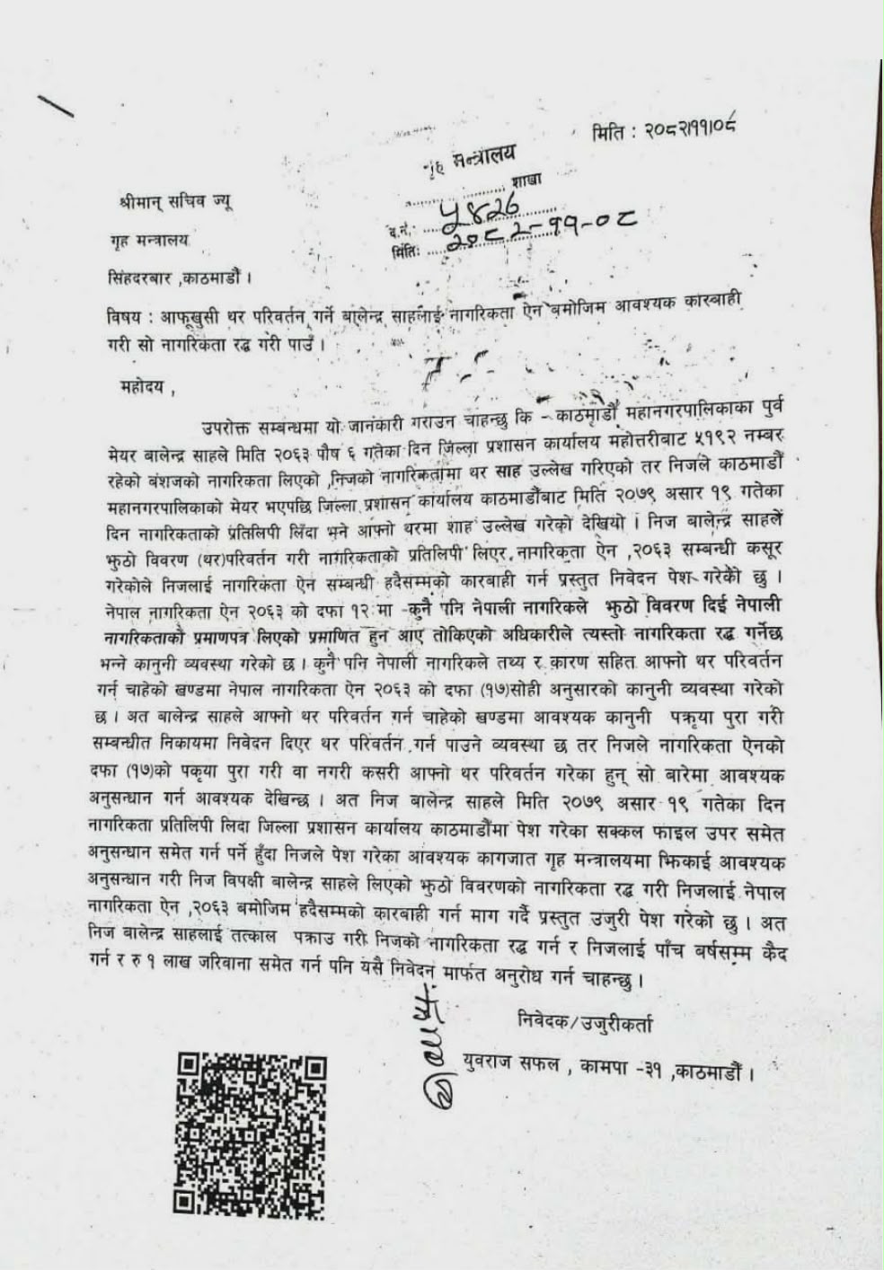 बालेनविरुद्ध गृह मन्त्रालयमा उजुरी