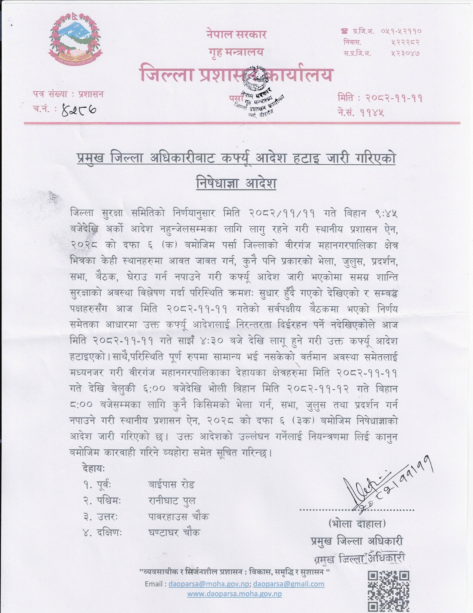 पर्सा । पर्साको वीरगञ्ज महानगरपालिकामा लगाइएको कर्फ्यू आदेश हटाइएको छ। सोमबार बिहान पौने १० बजेदेखि जारी कर्फ्यू आज अपराह्न साढे ४ बजे पछि हटाइएको प्रमुख जिल्ला अधिकारी भोला दाहालले जानकारी दिए।