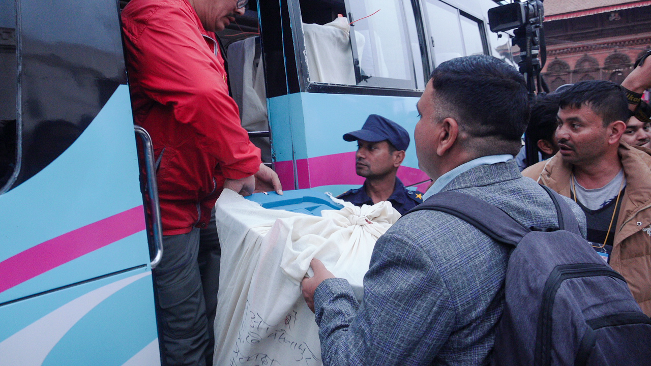 काठमाडौंको बसन्तपुर मतदान स्थलबाट मतदान सकिएसँगै मतपेटिका सुरक्षित रूपमा सील गरेर सम्बन्धित मतगणना स्थलतर्फ पठाइएका छन्।