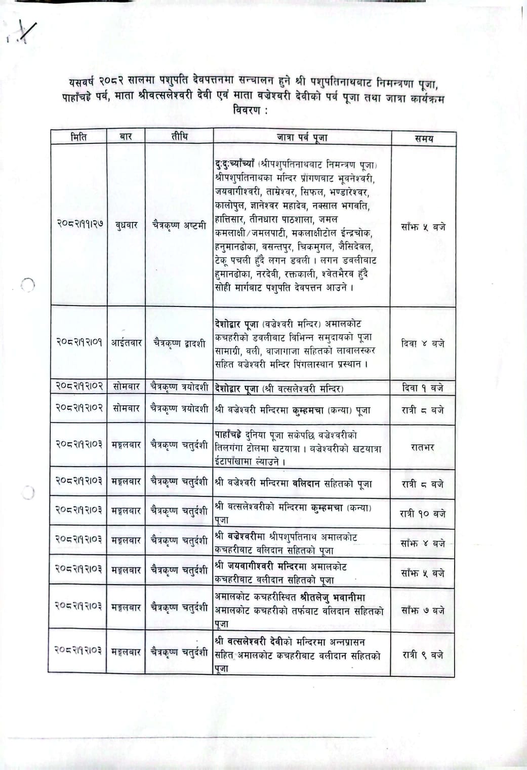 पशुपति देवपत्तनमा पूजा, पाहाँचरे पर्व, माता श्री वत्सलेश्वरी देवी एवं माता बज्रेश्वरी देवीको पर्व पूजा तथा जात्राको कार्यक्रमको समय तालिका सार्वजनिक भएको हो ।