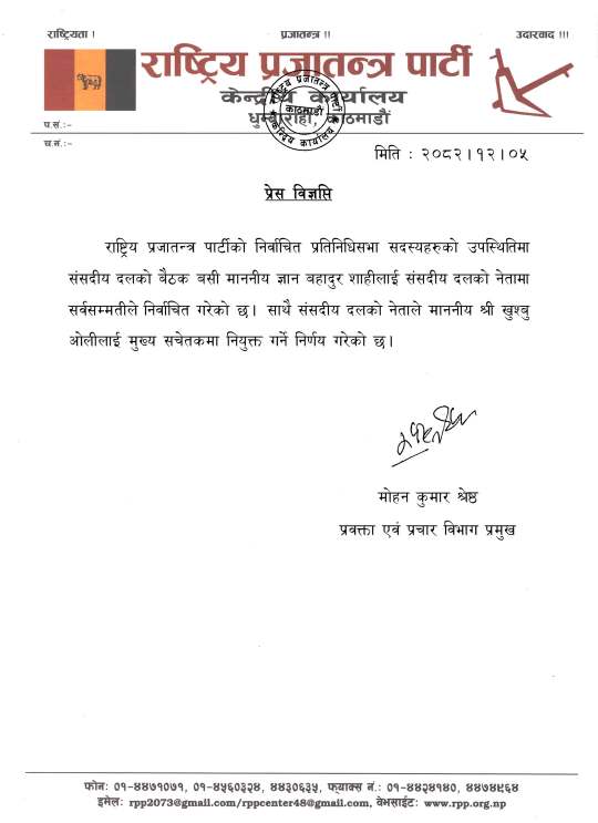 काठमाडौं। राप्रपाले संसदीय दलको नेतामा ज्ञानबहादुर शाहीलाई चयन गरेको छ।