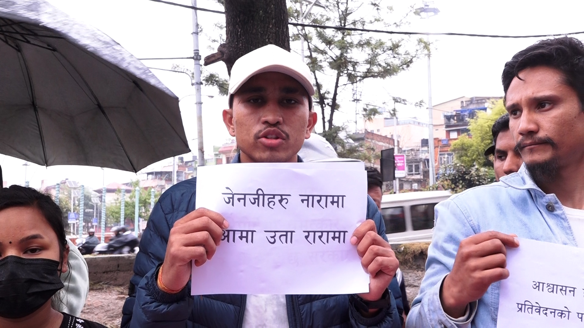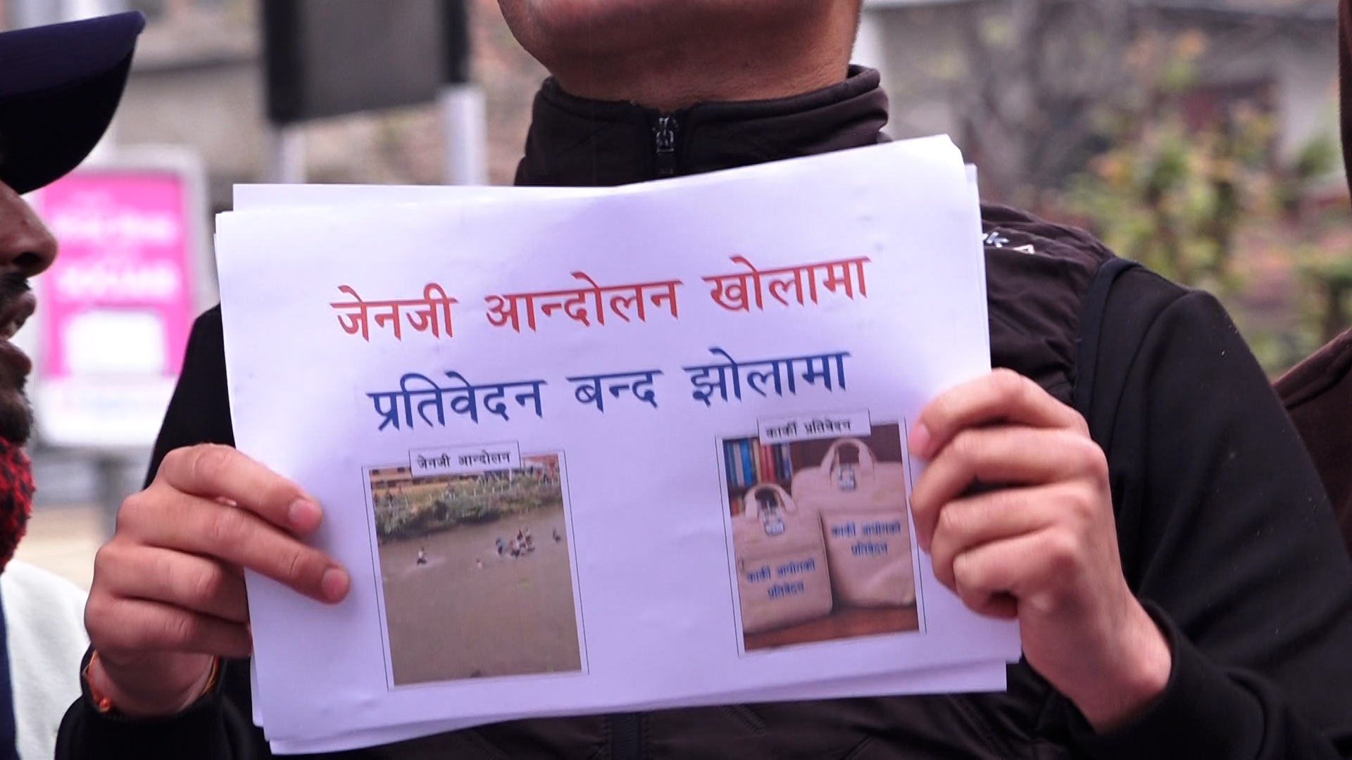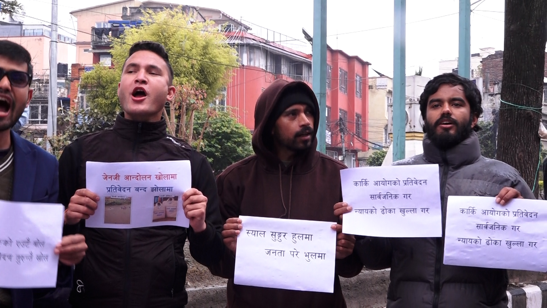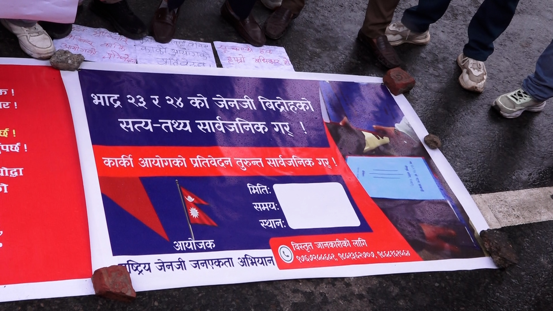 उनीहरूले जेनजी आन्दोलन खोलामा प्रतिवेदन झाेलामा, जेनजीहरू नारामा आमा रारामा तथा कार्की आयोगको प्रतिवेदन तुरून्त सार्वजनिक गर लगायतका प्ले कार्ड बोकेर प्रदर्शन गरेका हुन्।