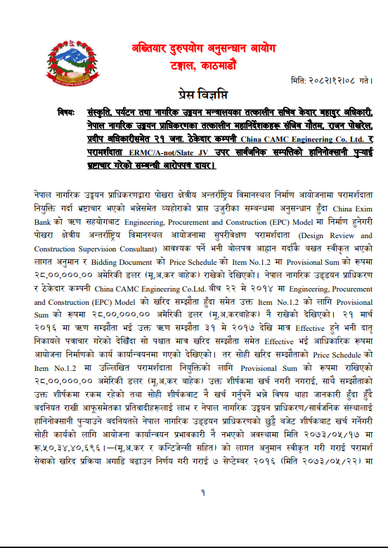 संस्कृति, पर्यटन तथा नागरिक उड्ययन मन्त्रालयका तत्कालीन सचिव केदाबहादुर अधिकारी, नेपाल नगारिक उड्ययन प्राधिकरणका तत्कालिन महानिर्देशकहरु संजिव गौतम, राजन पोखरेल र प्रदिप अधिकारीसमेत गरि २१ जना, ठेकेदार कम्पनी चाईना सिएएमसी ईन्जिनियरिङ कम्पनी लिमिटेड र परामर्शदार्ता ईआरएमसी/ए–नट/स्लेट जेभीउपर सार्वजनिक सम्पत्तिको हानिनोक्सानी पुरयाई भ्रष्टाचार गरेको भनेर अख्तियारले आज आरोपपत्र विशेष अदालतमा दायर गरेको हो।