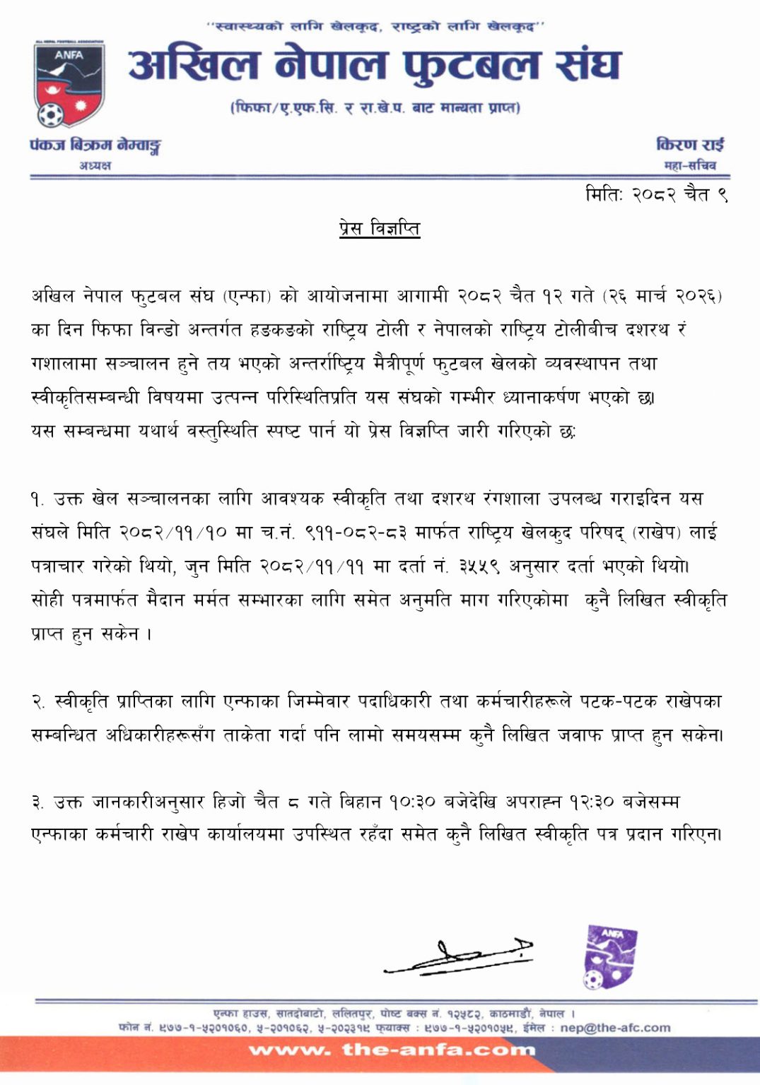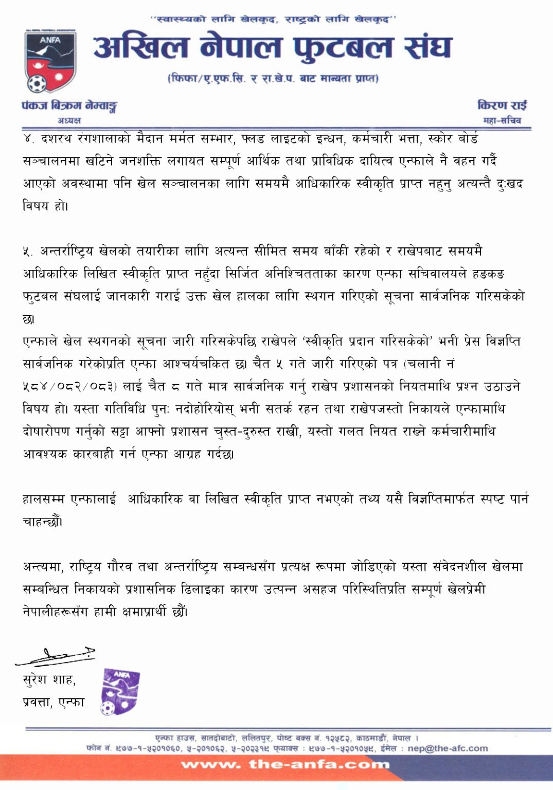 एन्फाले आइतबर कर्मचारी राखेप कार्यालयमा उपस्थित रहँदा समेत कुनै लिखित स्वीकृति पत्र प्रदान नगरिदिएको जनाएको छ । एन्फाले खेल स्थगनको सूचना जारी गरिसकेपछि राखेपले स्वीकृति प्रदान गरिसकेको भन्दै सार्वजनिक गरेको प्रेस विज्ञप्तिप्रति आश्चर्य व्यक्त गरेको छ । चैत ५ गते जारी गरिएको पत्र चैत ८ गते मात्र सार्वजनिक गरिएको भन्दै राखेपको नियतमाथि प्रश्न उठाएको छ ।
