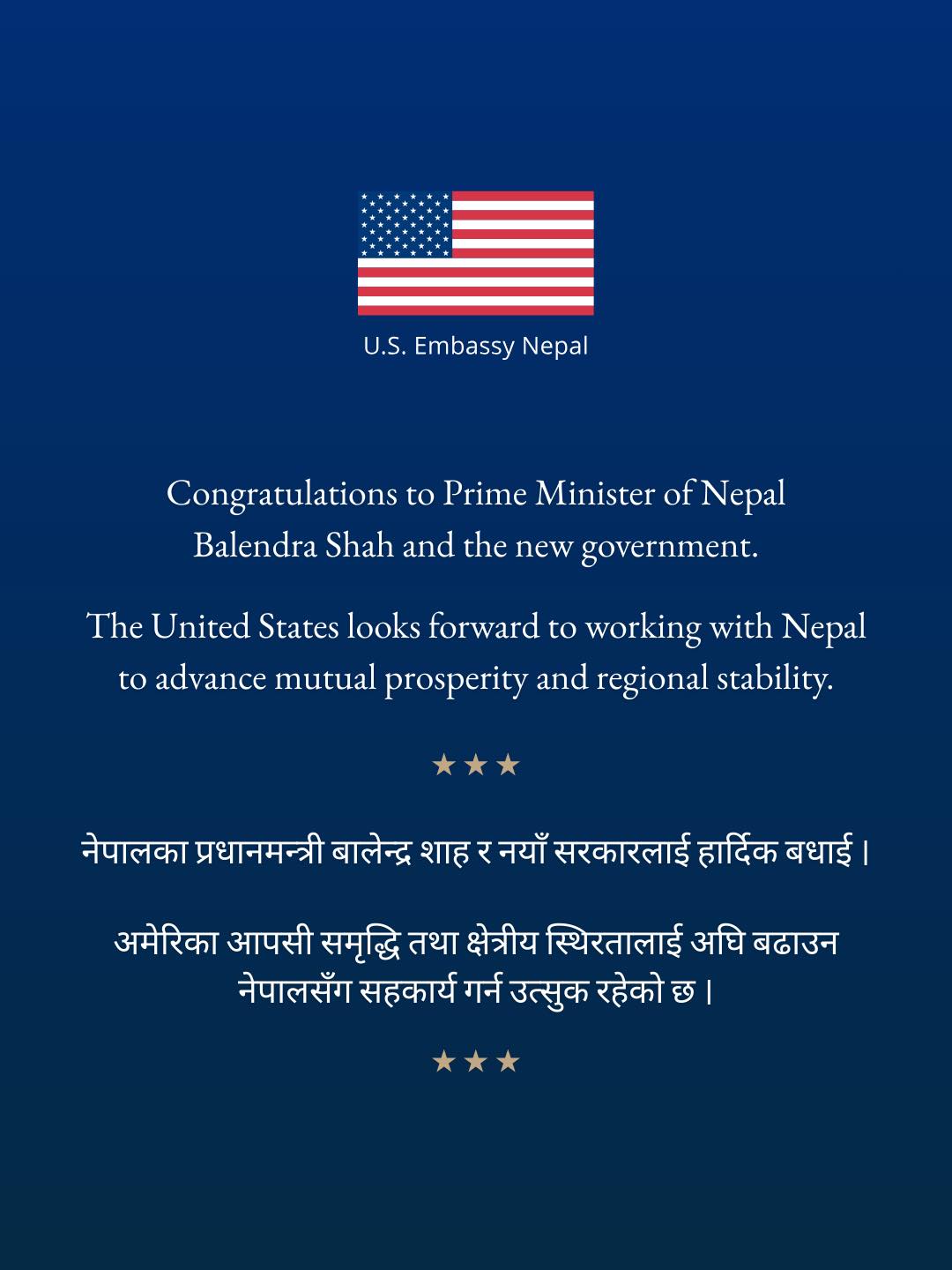 नेपालस्थित अमेरिकी दूतावासले फेसबुकमार्फत प्रधानमन्त्री शाहलाई बधाई दिएका हुन्।