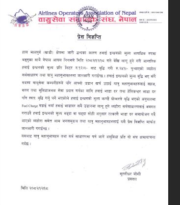 हवाई इन्धनको मूल्य वृद्धि कारण वायुसेवा संचालित संघका सदस्य वायुसेवा कम्पनीहरूले आफ्नो उडान भाडा र हेलिकप्टर भाडा दर स्वतः समायोजन गर्ने भएका हुन्।