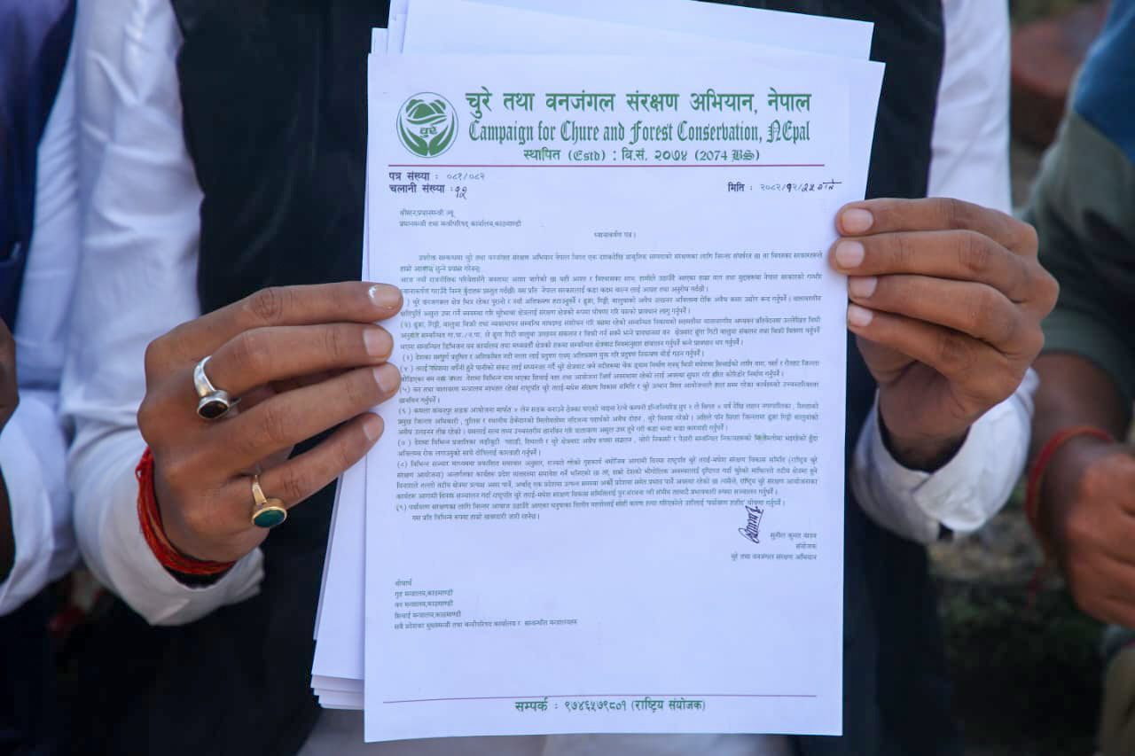चुरे तथा वन जंगल संरक्षण अभियान नेपालले माइतीघर मण्डलामा प्रदर्शन गरेकाे छ । वन–जंगल संरक्षण तथा सम्बर्द्धन, दलित भूमिहीन सुकुम्बासीहरूको भूमि अधिकार सुनिश्चित गर्न, अवैध उत्खनन रोक्न, सिर्सिया नदीको प्रदूषण र अतिक्रमण नियन्त्रण गर्न, साथै ढुङ्गा, गिट्टी, बालुवाको अवैध उत्खनन बन्द गरी अवैध क्रसर उद्योगहरू बन्द गरिनुपर्ने लगायतका माग राख्दै माइतीघर मण्डलामा प्रदर्शन गरेका हुन् । सिंहदरबारको ढोका कसको लागि खुल्छ? राष्ट्रको समस्या कहिले देख्दैन सरकार? भन्ने प्लेकार्डसहित प्रदर्शन गरेका हुन् । सहभागीहरूले सरकारको ध्यान वातावरणीय समस्यातर्फ आकर्षित गराएका छन्।
