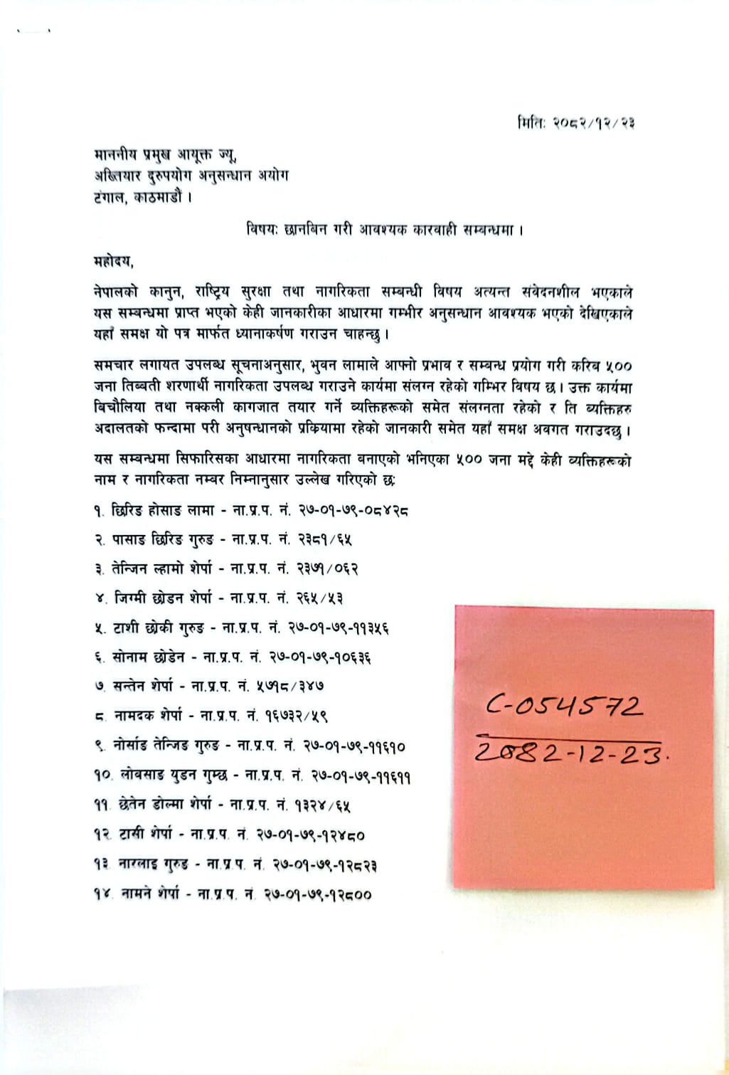 उजुरीकर्ताले लामाले करिब ५ सय जना तिब्बती शरणार्थीलाई नेपाली नागरिकता दिलाएको दावी गरेका छन् । नाम नखुलाई अख्तियारमा दिइएको उजुरीमा उजुरीकर्ताले लामाले नागरिकता दिलाएको भनिएका १७ जनाको नाम र नागरिकता नम्बर समेत किटान गरी लेखेका छन् ।