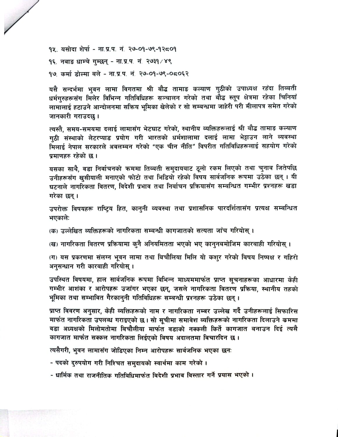 काठमाडौं । काठमाडौं महानगरपालिका वडा नम्बर ६ का वडाध्यक्ष भुवन लामाले आफ्नो पदीय हैसियतको दुरुपयोग गरी तिब्बती शरणार्थीहरुलाई नेपाली नागरिकता दिलाएको आरोप लागेको छ । यस विषयमा अनुसन्धान गर्न माग गर्दै अख्तियार दुरुपयोग अनुसन्धान आयोगमा उजुरीसमेत दर्ता गरिएको छ ।